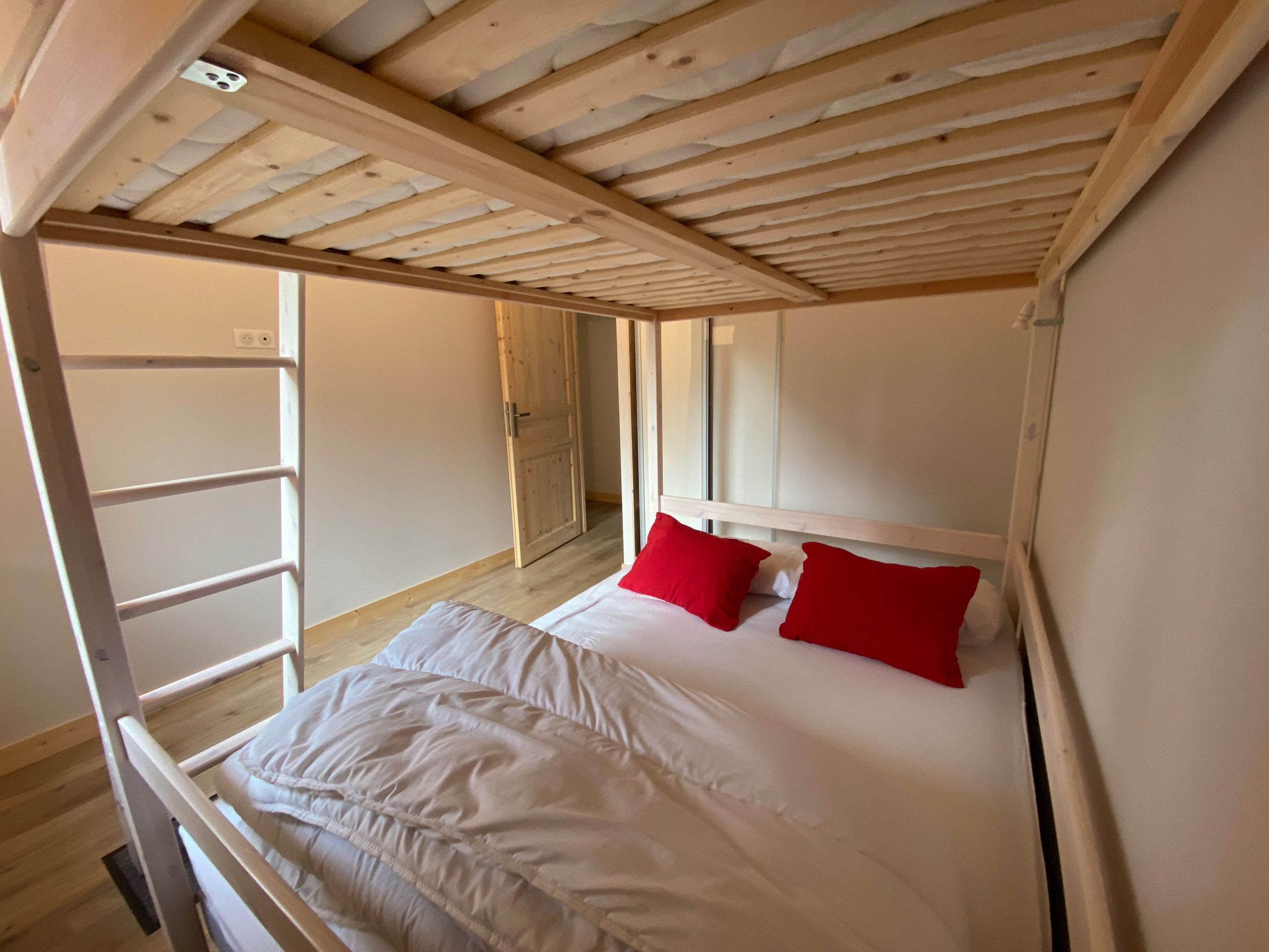 Superb new 58 m2 apartment in the Masseboeuf district in Le Lioran, just a few metres from the ski slopes. Located on the -2 level of the Les Estives chalet, you will find in this fully equipped and comfortable ground floor accommodation, a large entrance with a wardrobe and washing machine, a first bedroom with double bunk beds in 160x200 and a second bedroom with a double bed in 160x200. Each of them is equipped with a storage wardrobe.