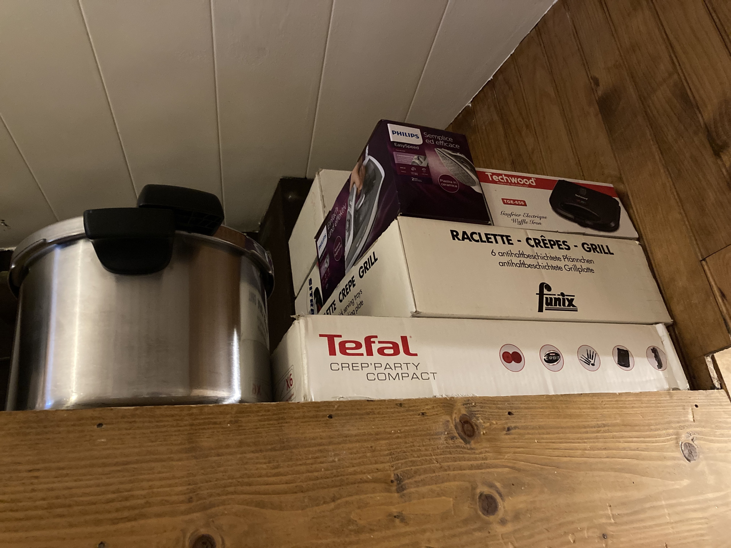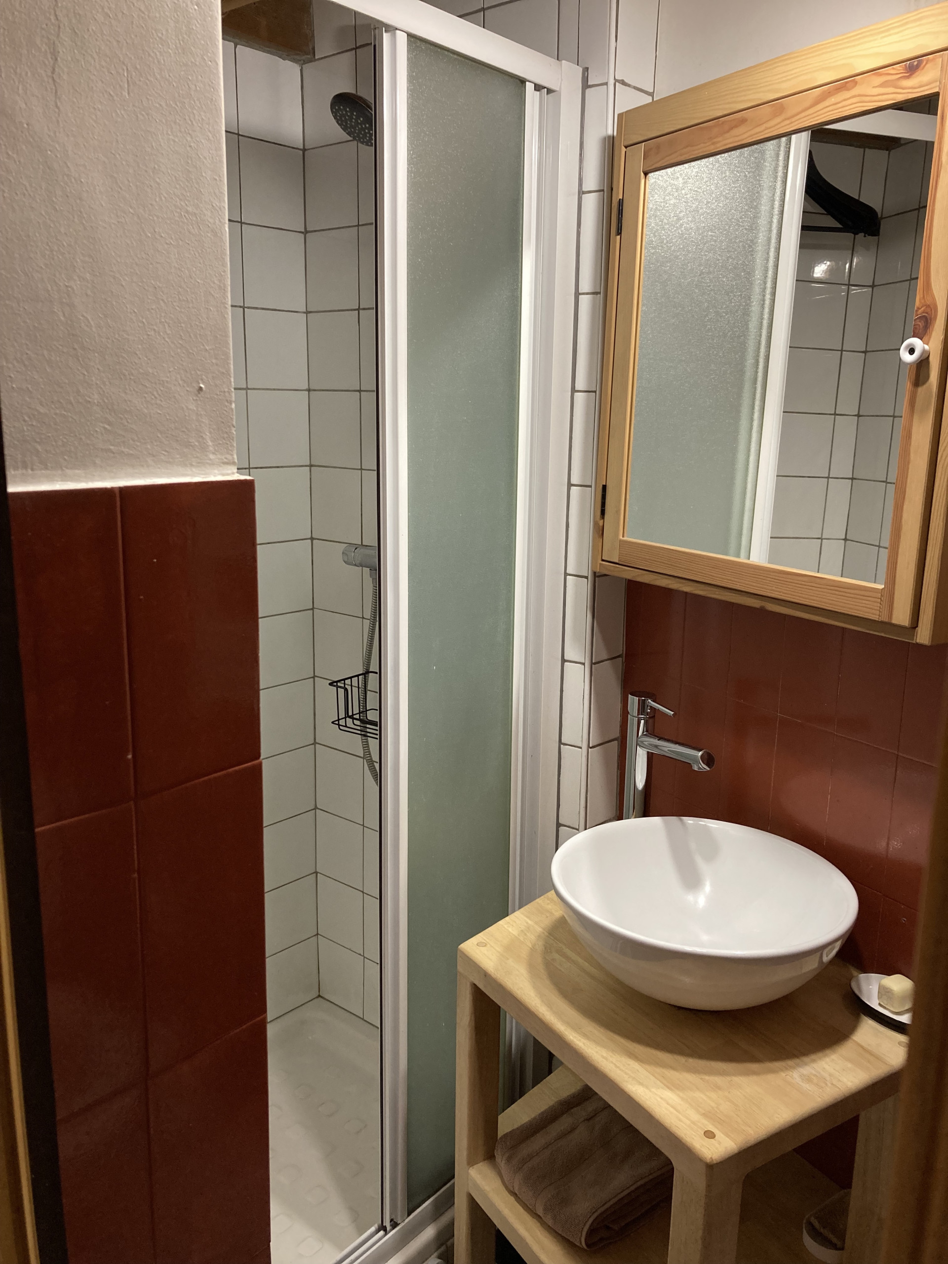 This apartment has a living area open to a fully equipped kitchen (filter coffee maker and SENSEO, mini oven, microwave, toaster, raclette machine, kettle, immersion blender, crockery and utensils, crepe maker, pressure cooker, top refrigerator with small freezer compartment...