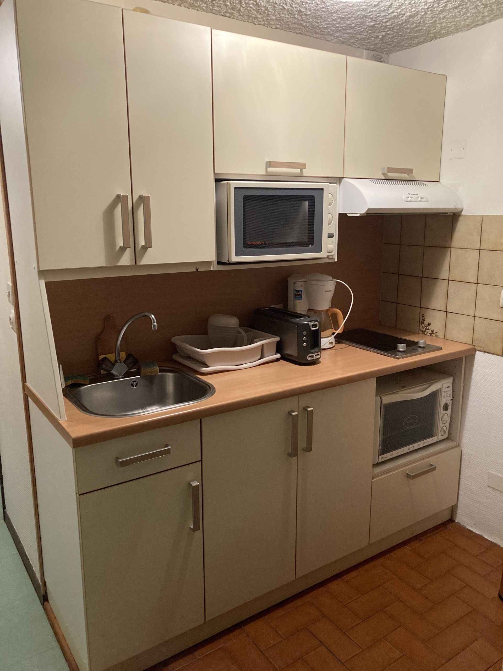 This accommodation for 4 people will offer you a fully equipped kitchen with fridge, electric hob, traditional filter coffee maker, toaster, microwave, small electric oven and a television.