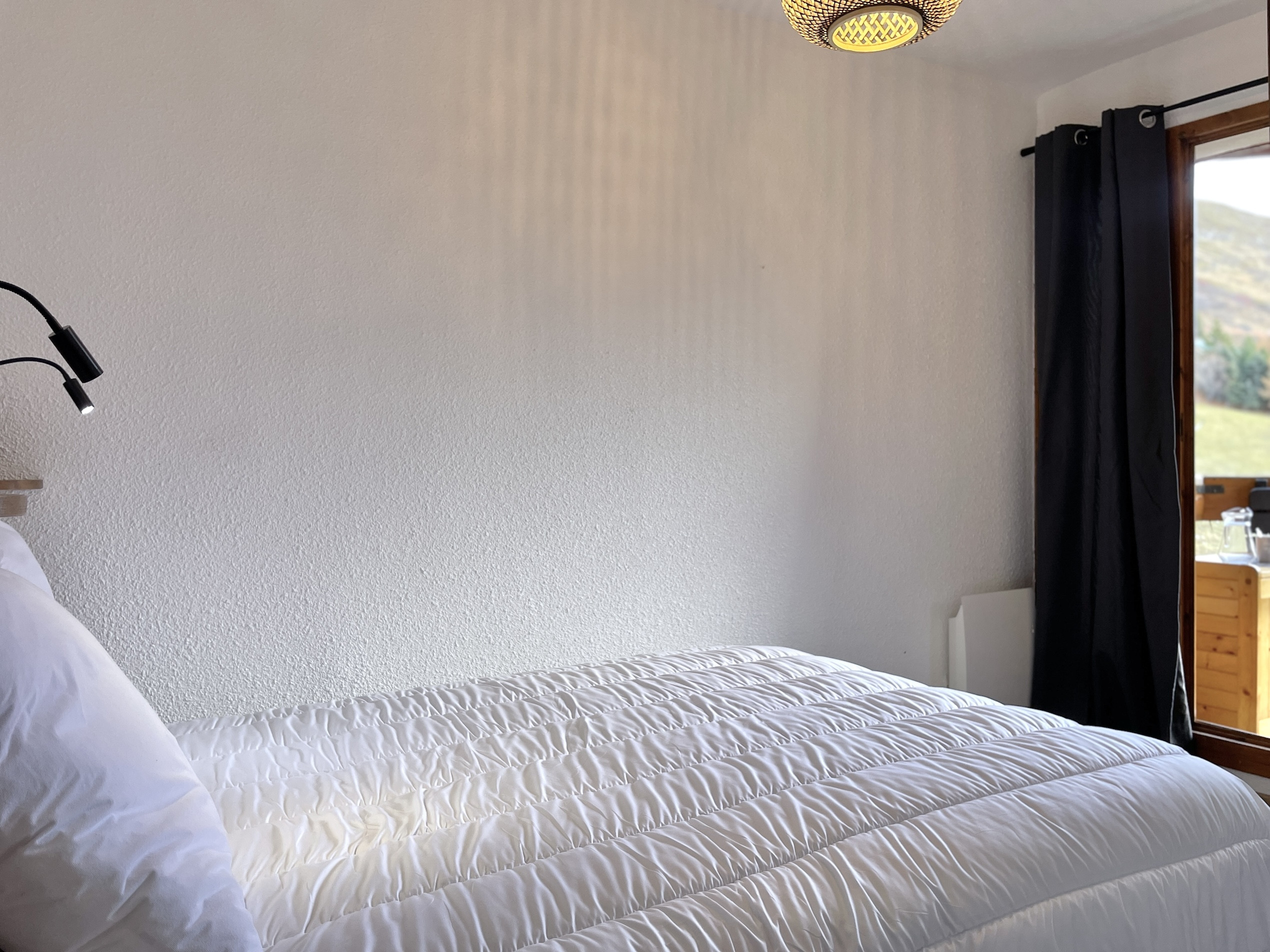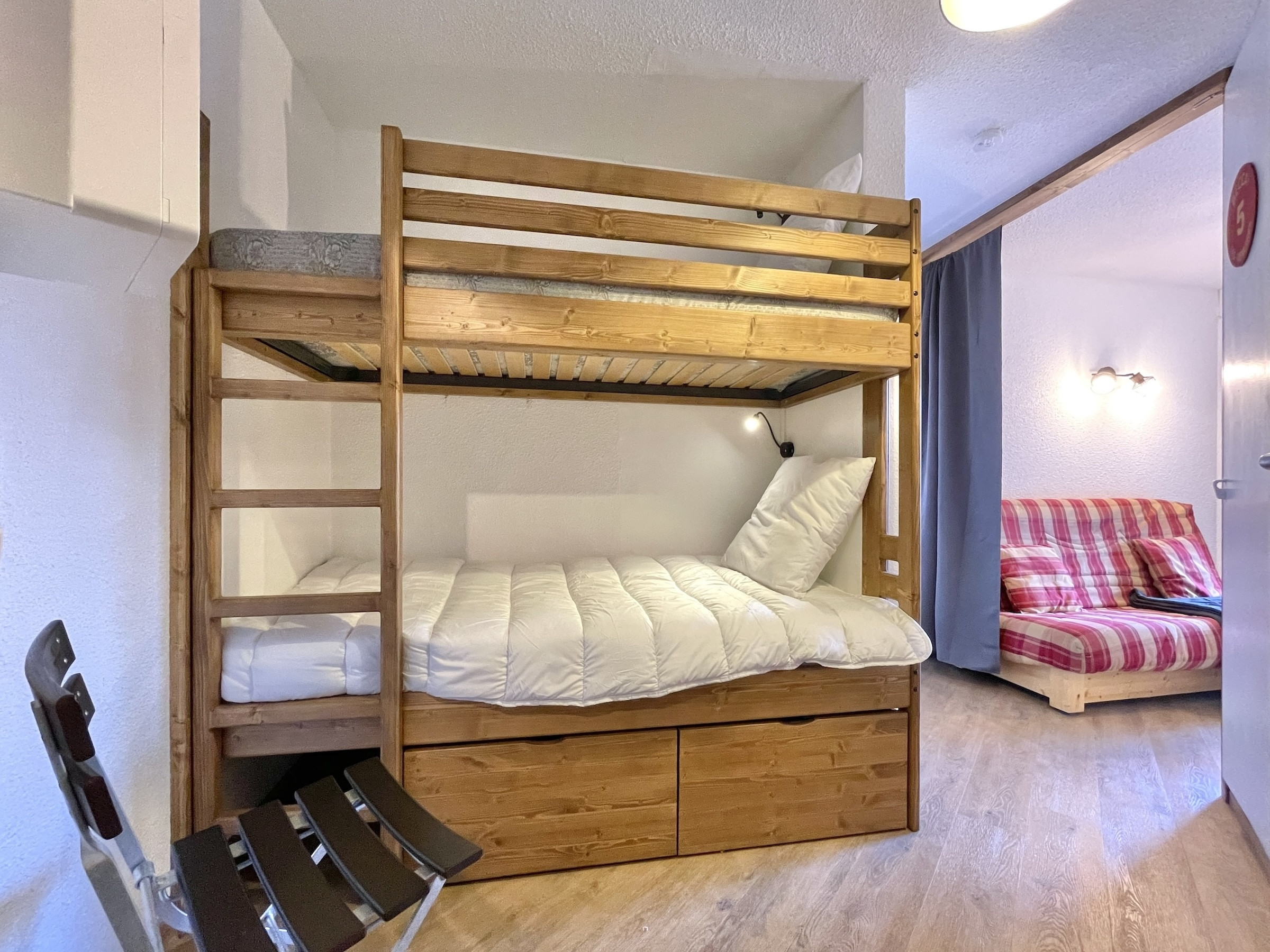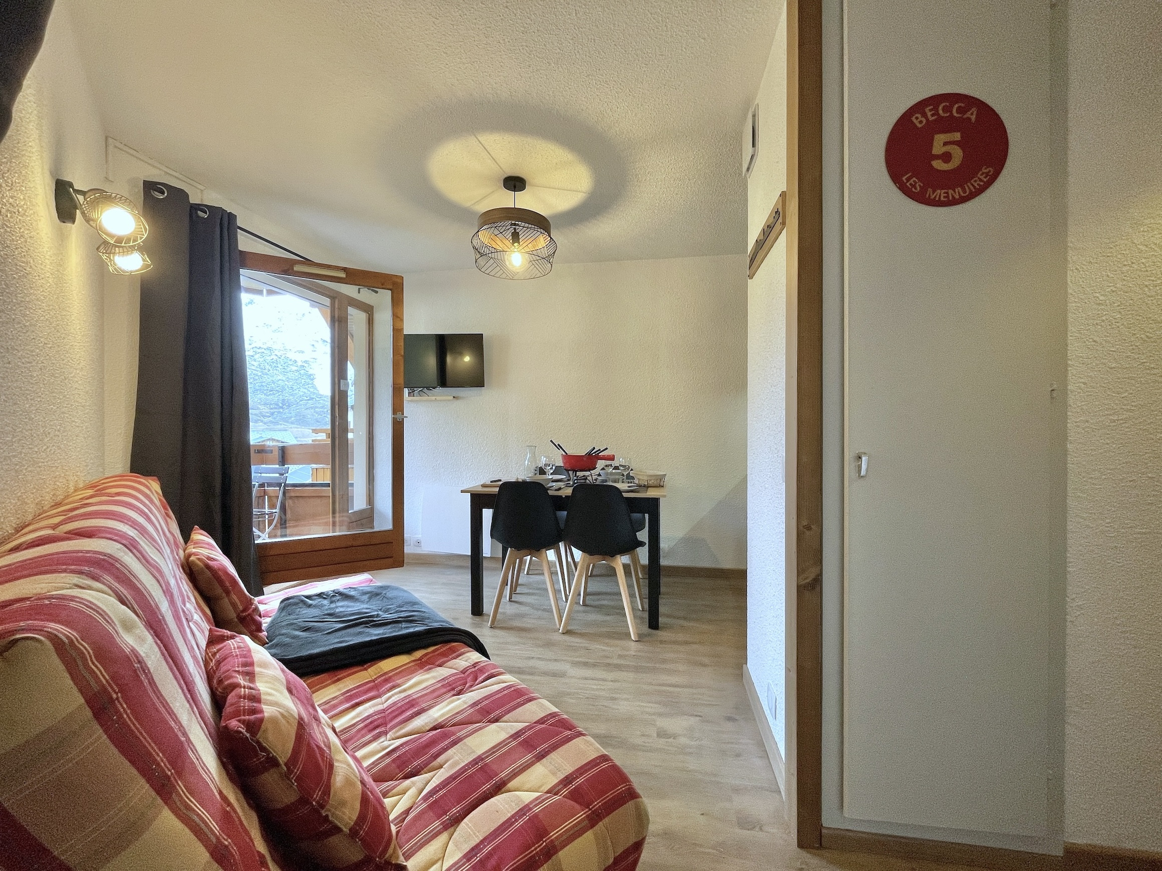 El apartamento cuenta con una distribución inteligente con un rincón de montaña nada más entrar compuesto por 2 camas superpuestas (ancho 80 cm), un cuarto de baño con bañera y aseo, un toallero eléctrico. Una cortina separa este espacio del salón que quiere ser acogedor. Dispone de un sofá tipo clic clac convertible en cama doble (ancho 140 cm), un televisor y un espacio de comedor que permite comidas agradables alrededor de un aparato de fondue o raclette. La cocina abierta totalmente equipada permitirá a las familias preparar deliciosas comidas con sus equipamientos modernos como el horno grill, el lavavajillas, el frigorífico, la placa vitrocerámica, y la cafetera, hervidor, tostadora. (sin microondas)
