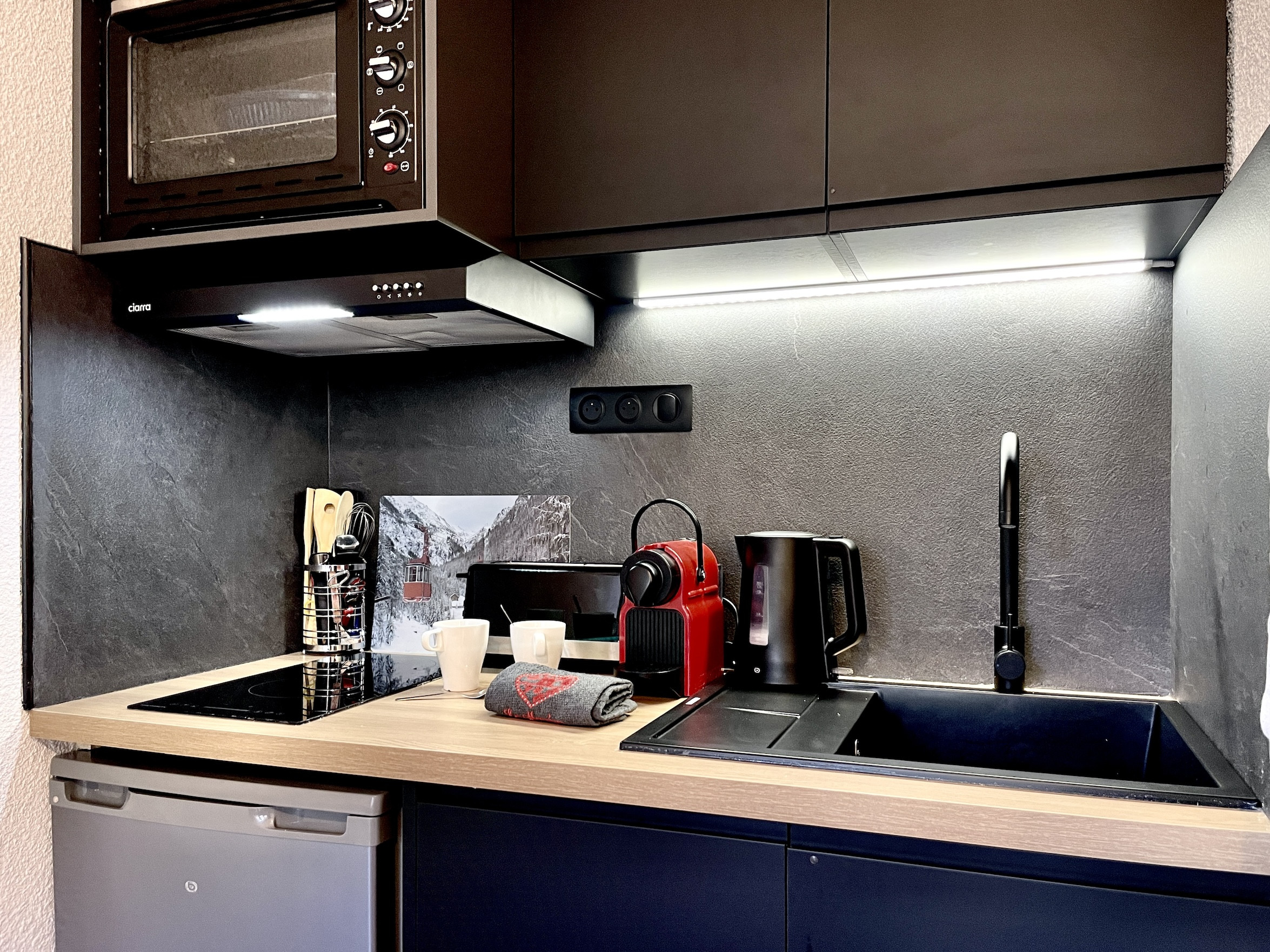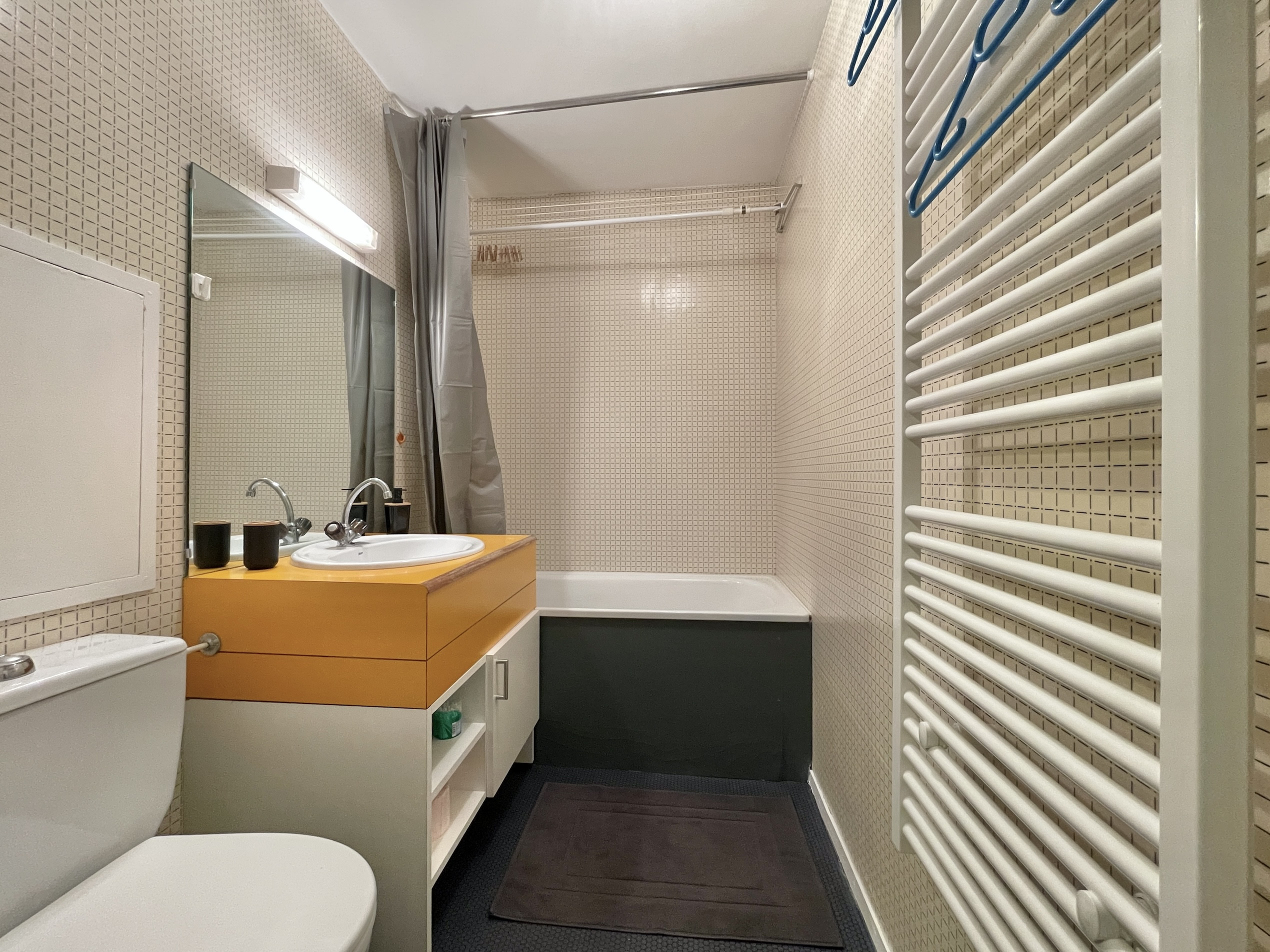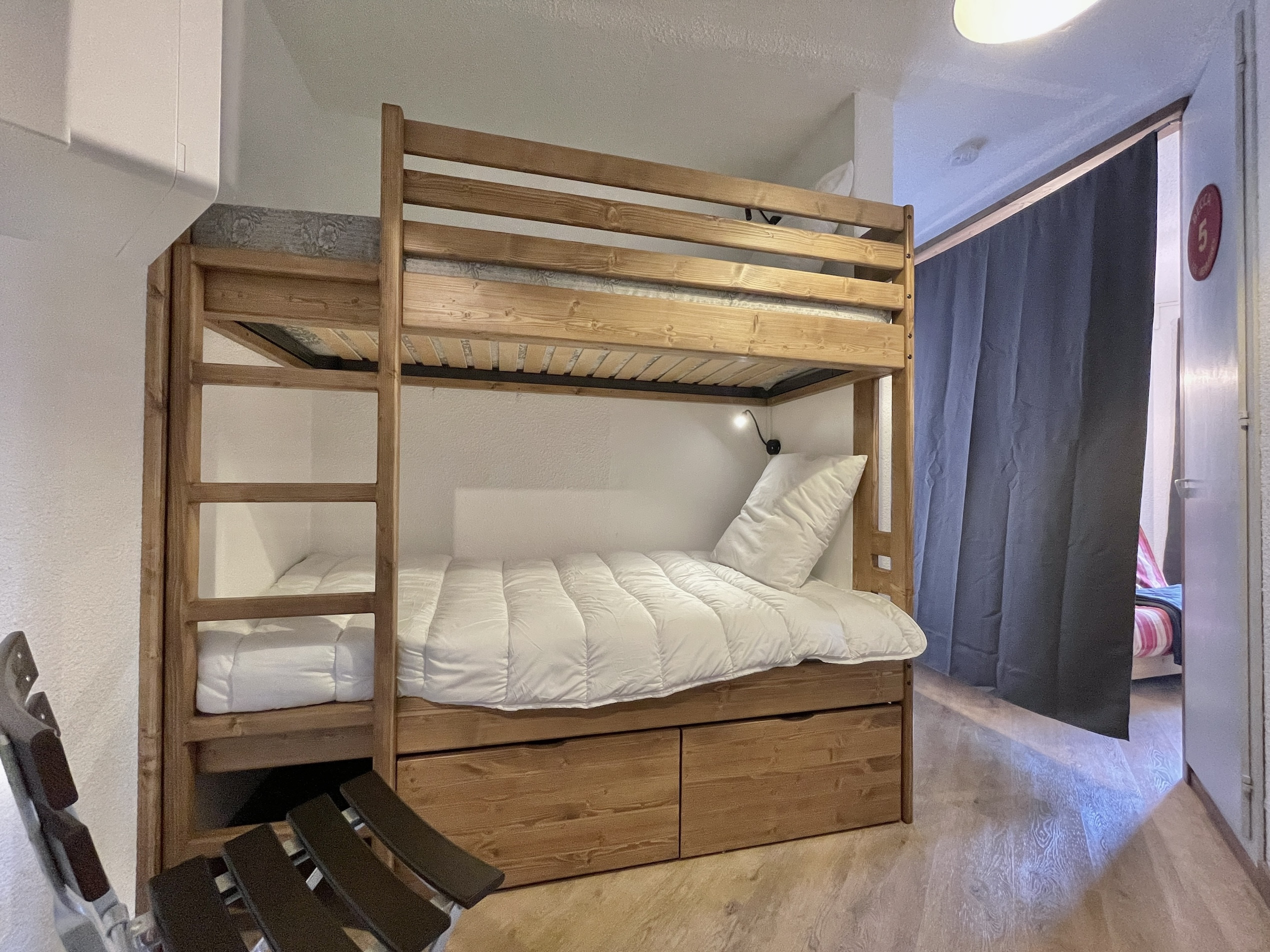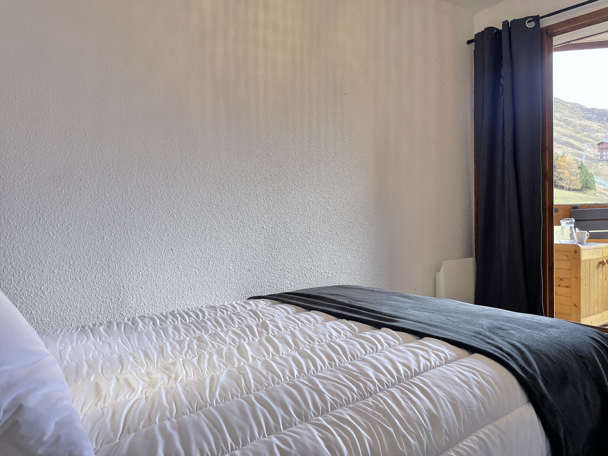 El apartamento cuenta con una distribución inteligente con un rincón de montaña nada más entrar compuesto por 2 camas superpuestas (ancho 80 cm), un cuarto de baño con bañera y aseo, un toallero eléctrico. Una cortina separa este espacio del salón que quiere ser acogedor. Dispone de un sofá tipo clic clac convertible en cama doble (ancho 140 cm), un televisor y un espacio de comedor que permite comidas agradables alrededor de un aparato de fondue o raclette. La cocina abierta totalmente equipada permitirá a las familias preparar deliciosas comidas con sus equipamientos modernos como el horno grill, el lavavajillas, el frigorífico, la placa vitrocerámica, y la cafetera, hervidor, tostadora. (sin microondas)