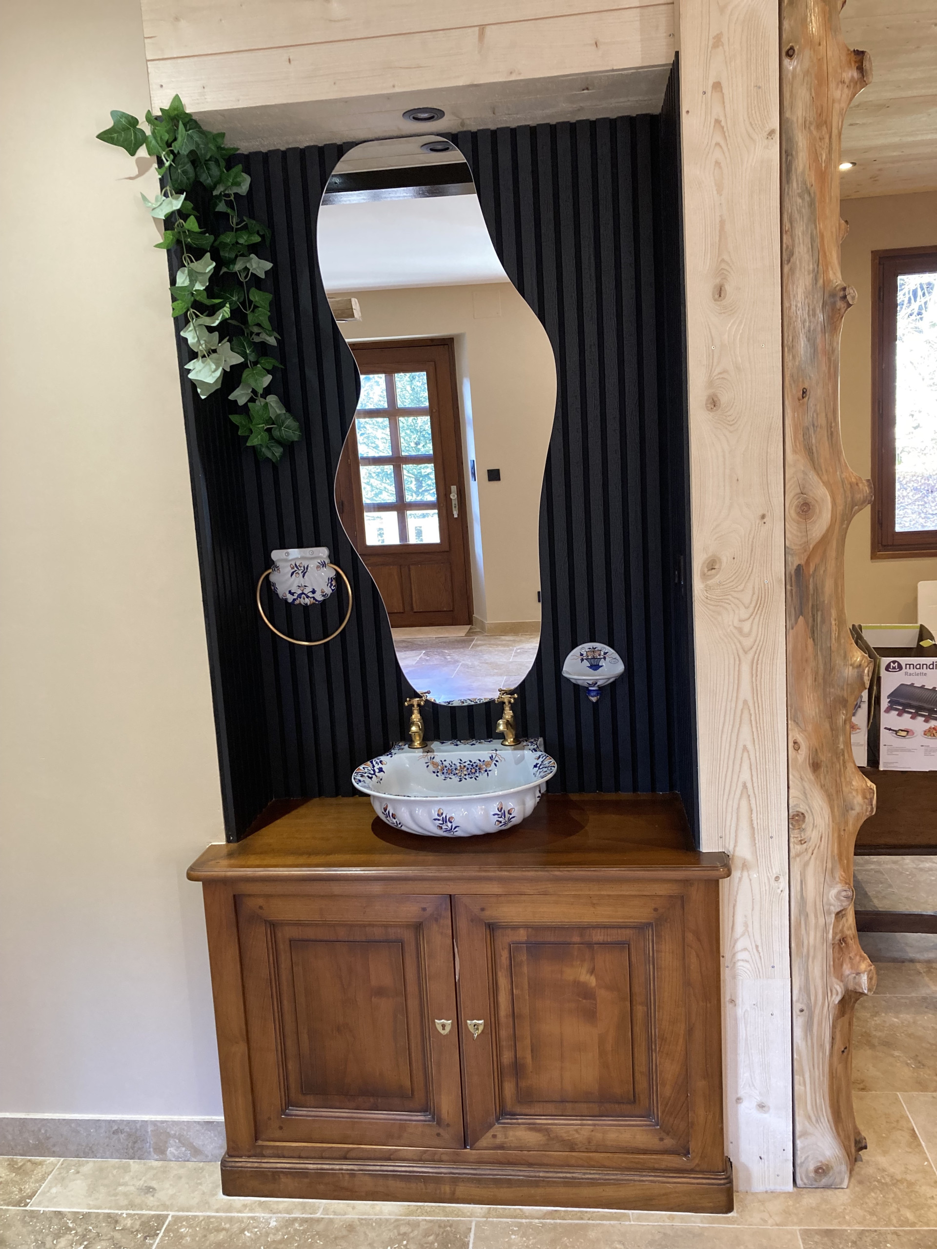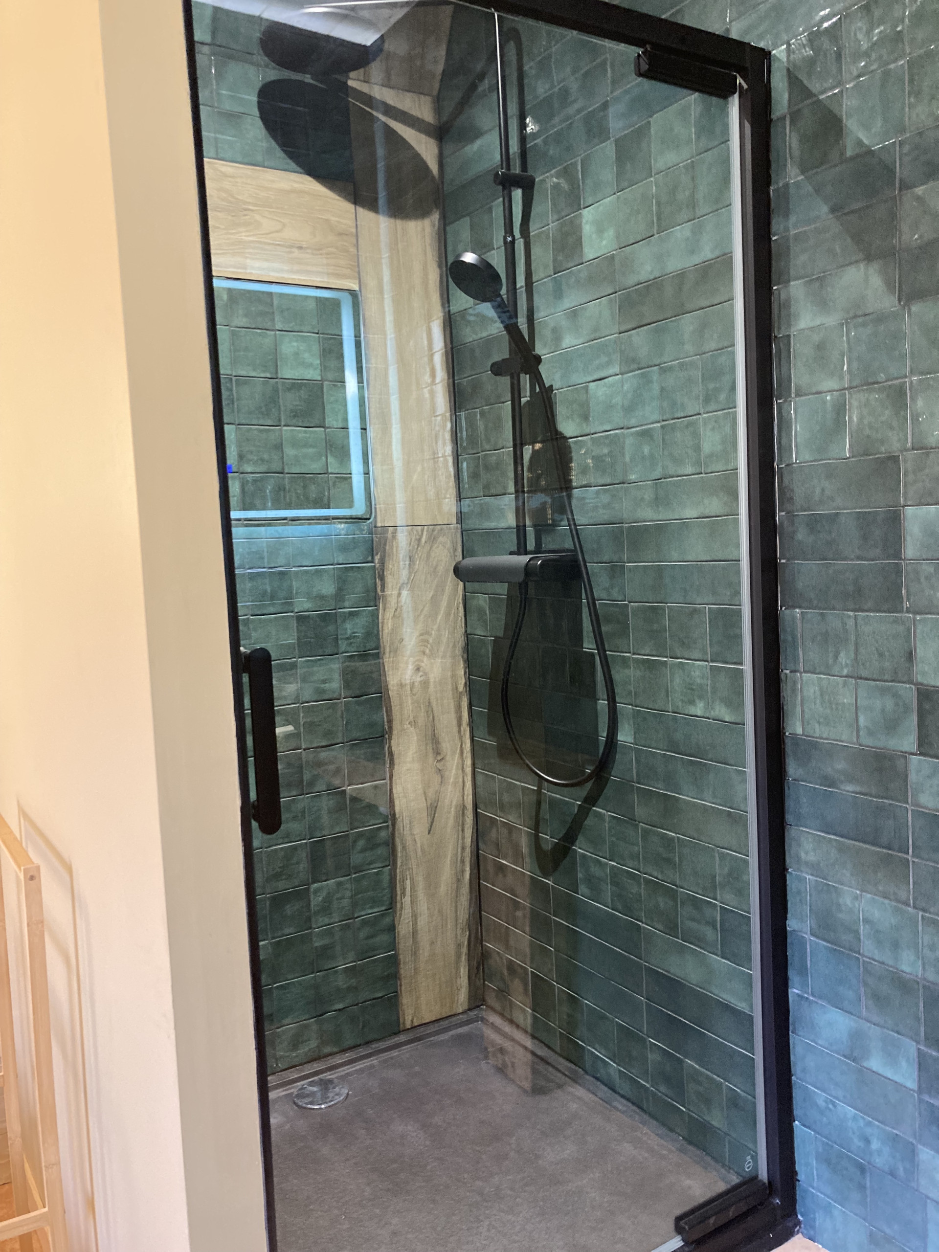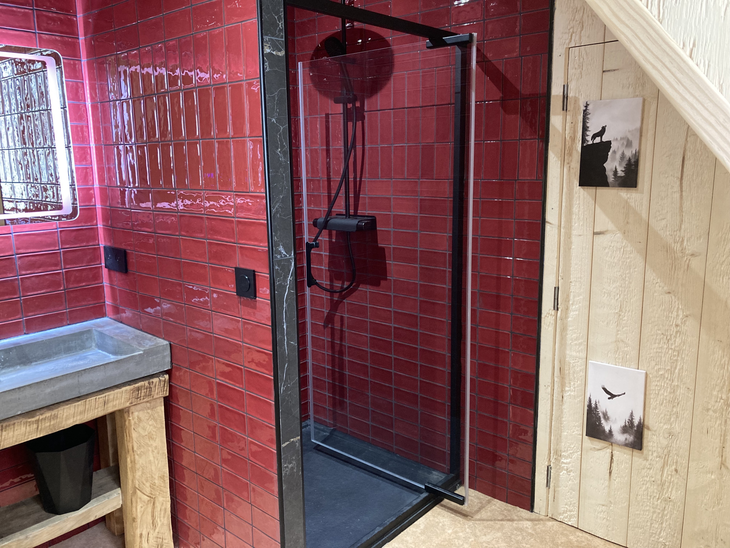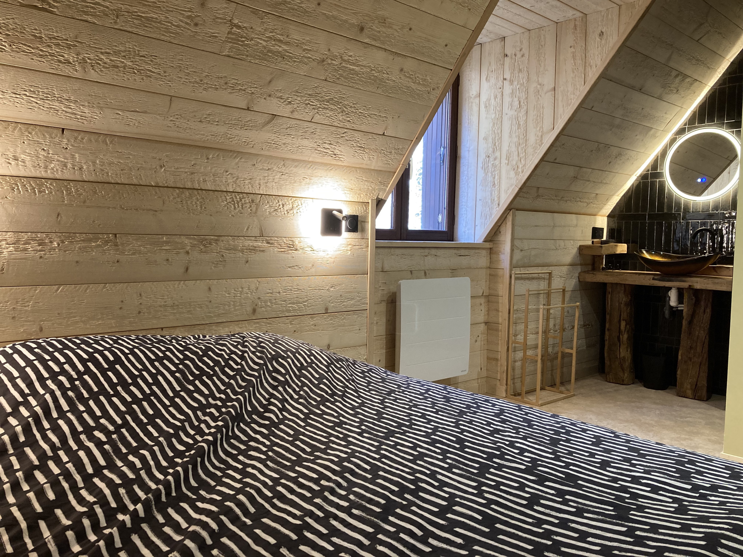 Finalmente en este nivel encontrará un primer aseo independiente y una primera habitación (la pista azul) con una cama doble de 160x200, su cuarto de baño privado con ducha, bañera de hidromasaje y una decoración en el espíritu de bienestar absoluto.