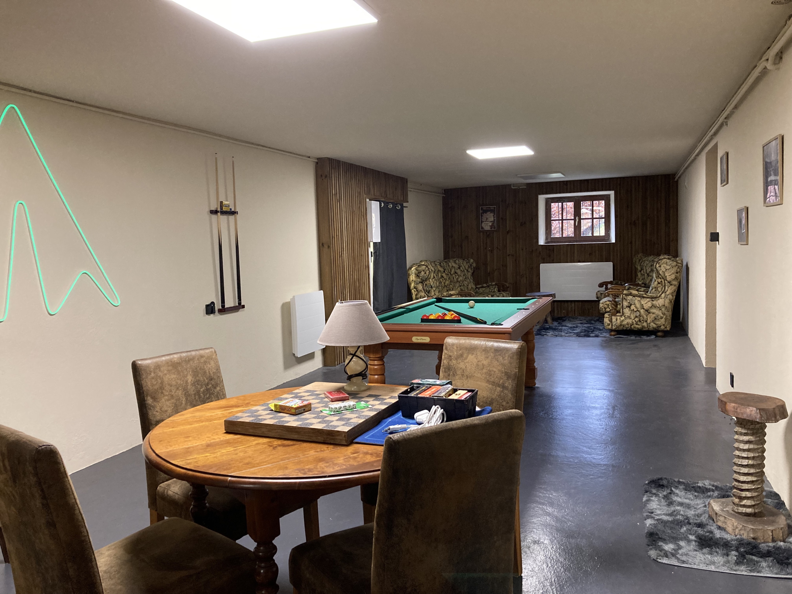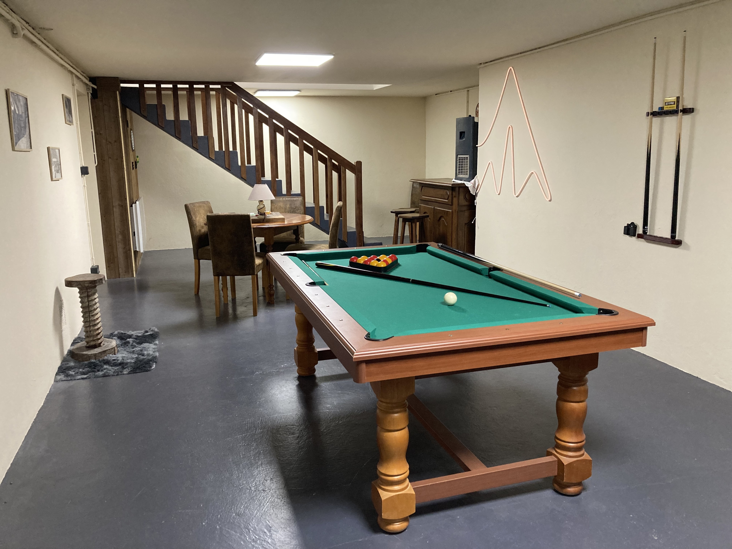 El primer nivel habitable le ofrecerá un espacio de ocio con billar, diana, rincón de bar, sala de juegos para niños, lavandería XXL con lavadora y secadora (8 kg).