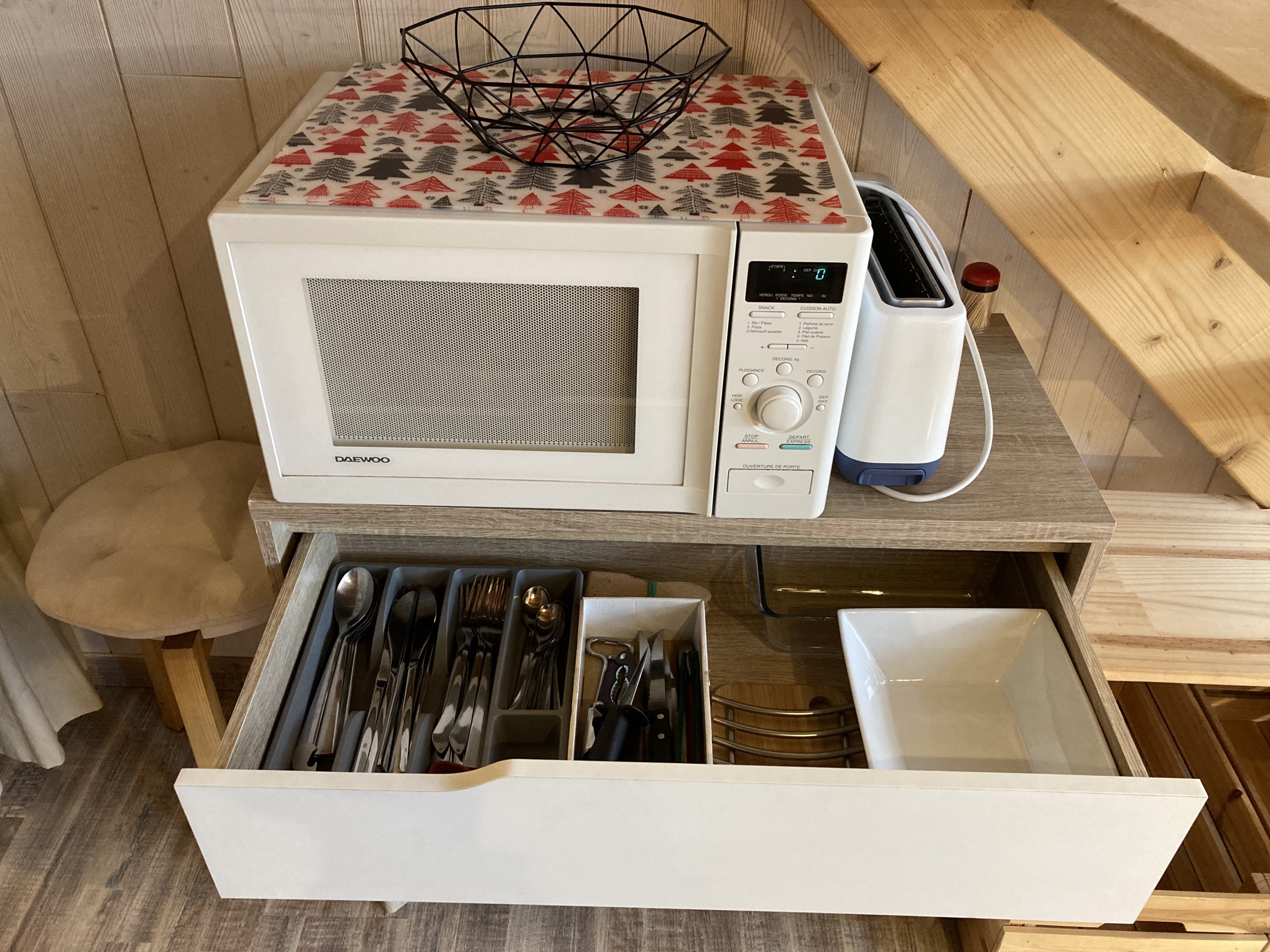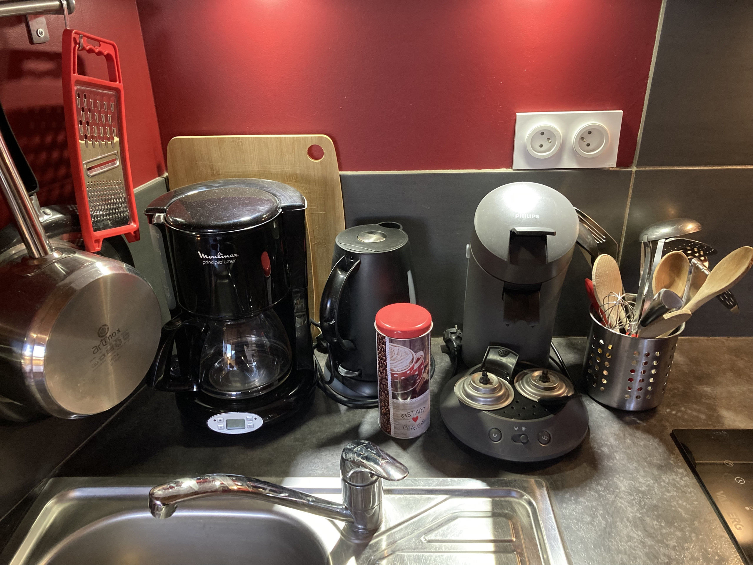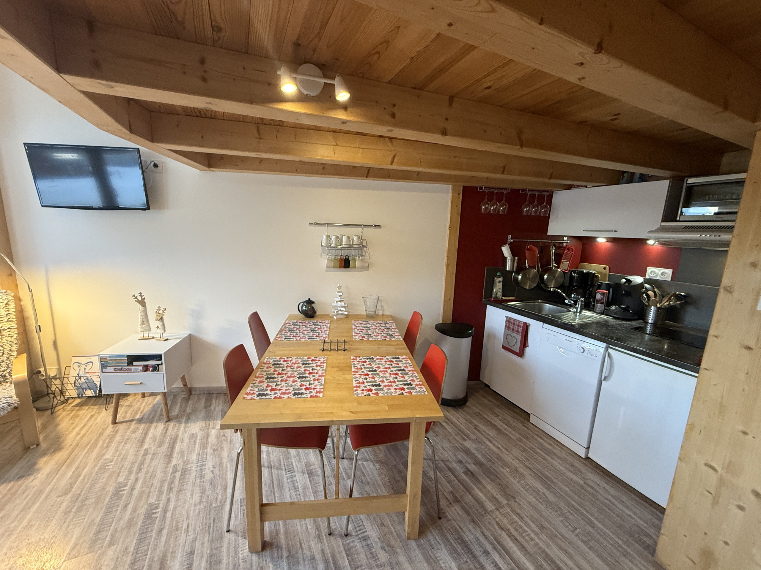 Este apartamento cuenta con una sala de estar abierta a una cocina equipada (cafetera de filtro y SENSEO, mini horno, microondas, tostadora, raclette, hervidor, batidora de mano, vajilla y utensilios, máquina de crepes, olla a presión, frigorífico con pequeña zona de congelador...
