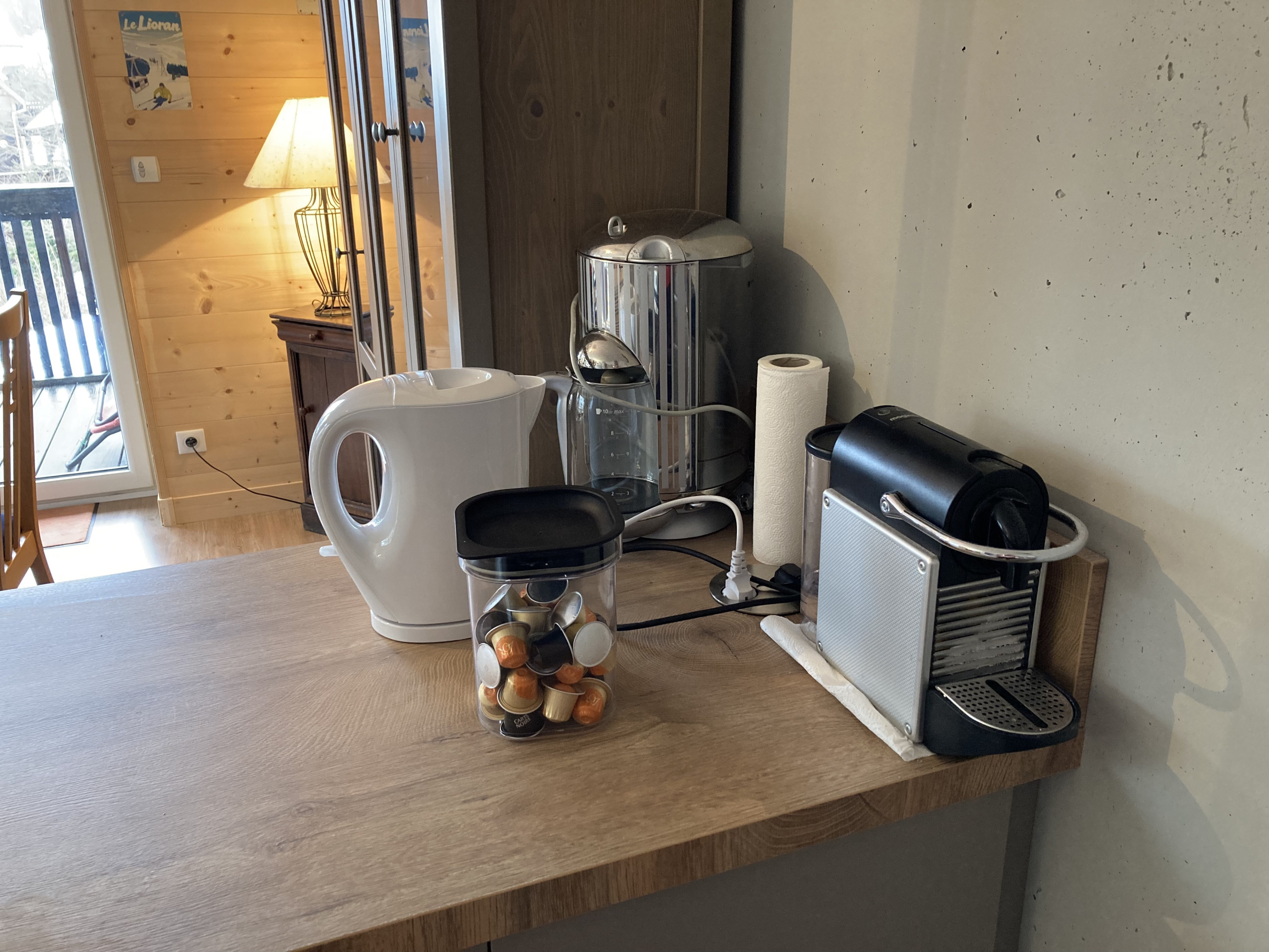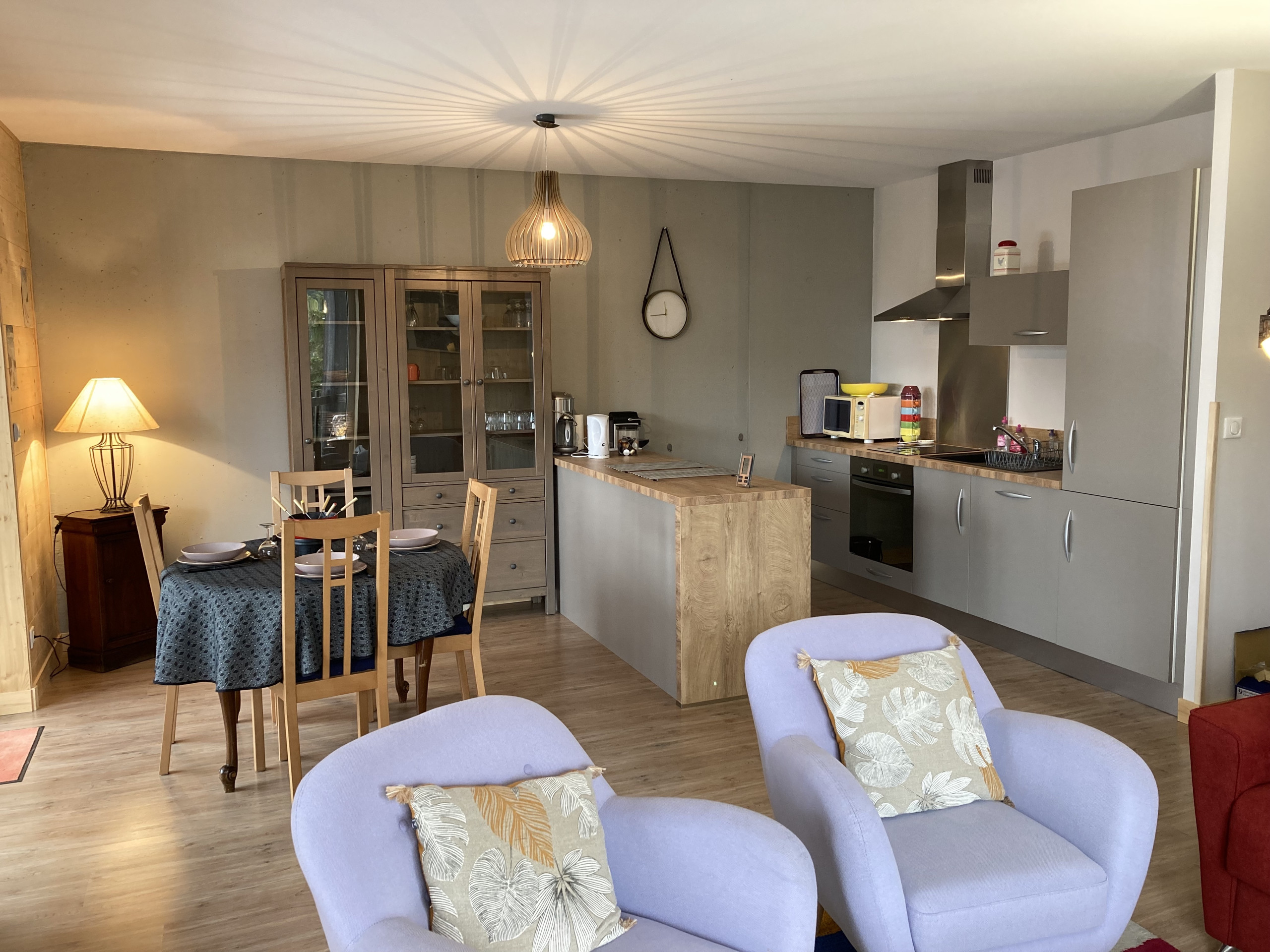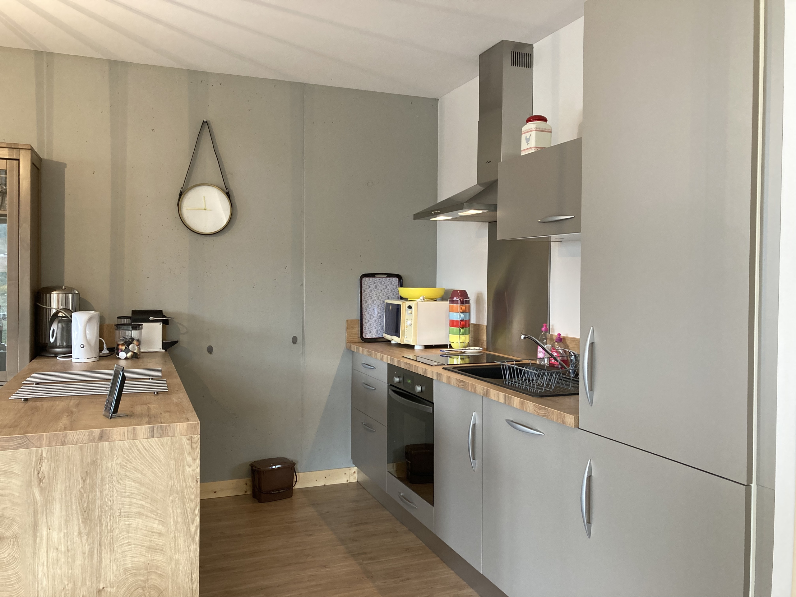 Une cuisine tout équipée(lave vaisselle, réfrigérateur/congélateur, micro-ondes, appareil à fondue, appareil à raclette, gaufrier, cafetière Nespresso et à filtre, bouilloire, four,... ouverte sur le salon/salle à manger offre un espace de vie convivial avec télévision.
