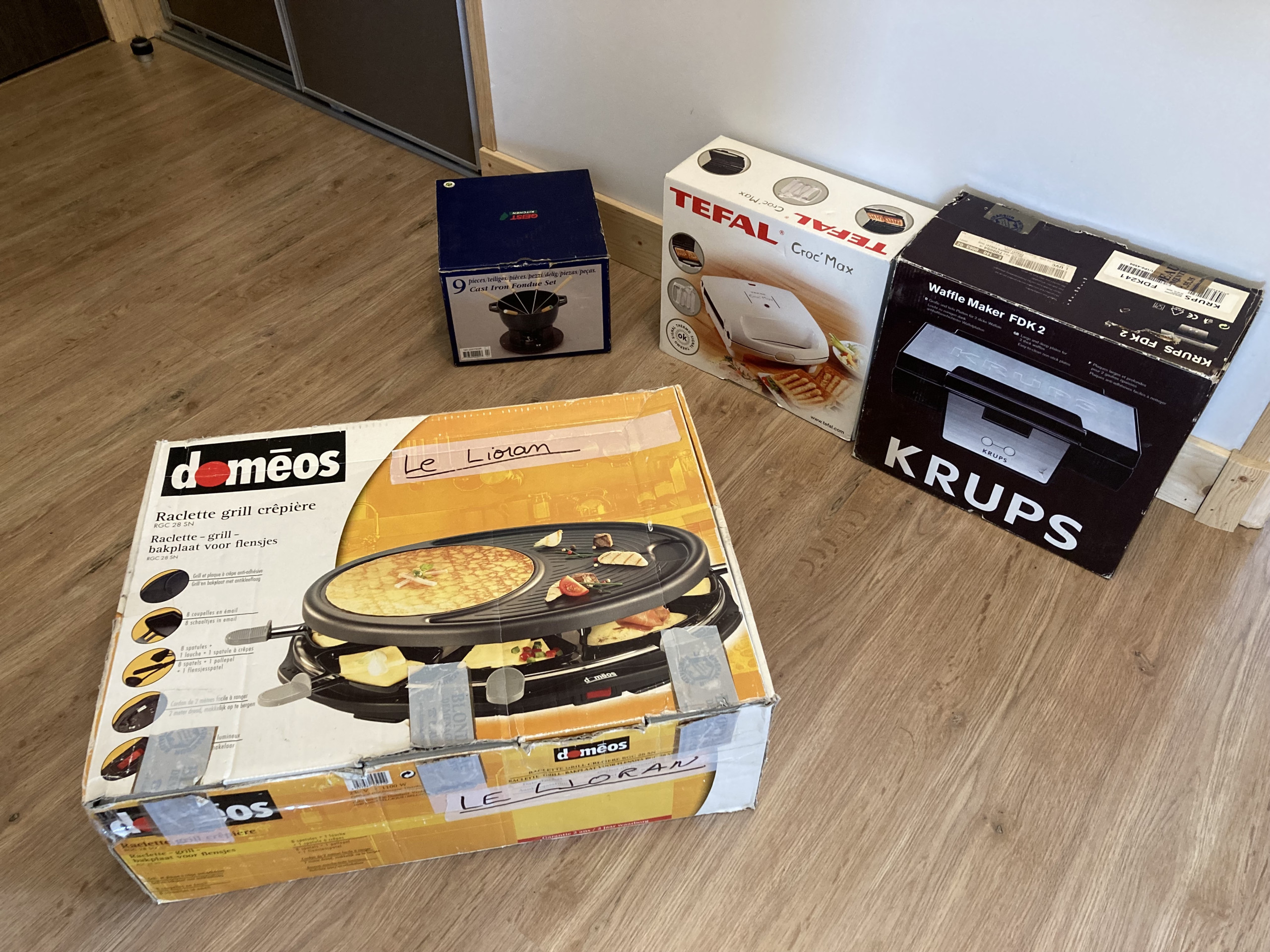 Aspirateur, étendoir à linge, jeux de société, réhausseur de chaise pour enfant présent dans ce logement.