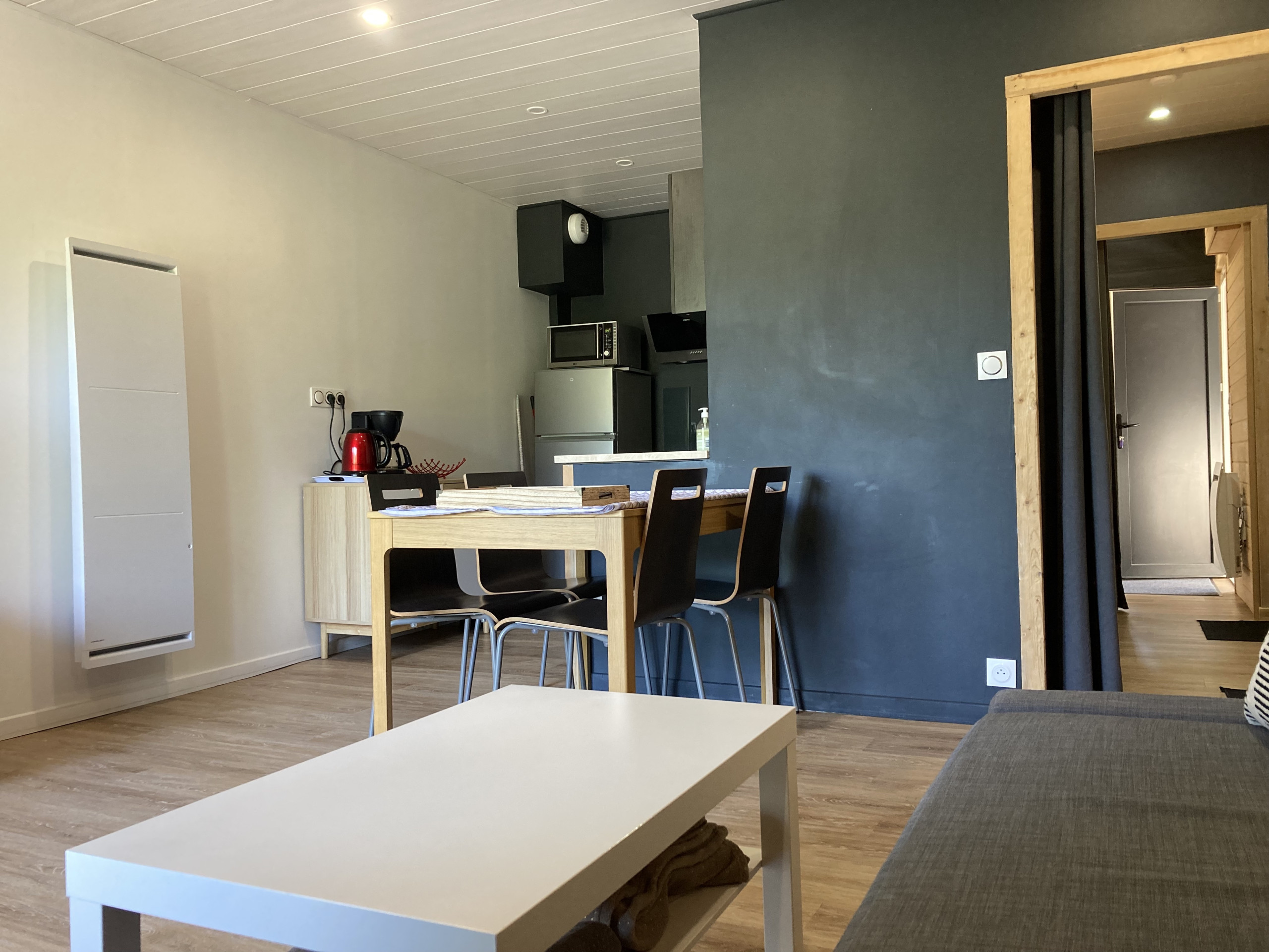 Ce logement chaleureux est composé d'un séjour avec sa cuisine ouverte et toute équipée (four, micro-ondes, appareil à raclette, réfrigérateur/congélateur, lave vaisselle, cafetière senseo et filtre, bouilloire, grille pain...). Un balcon avec mobilier extérieur vous permettra de profiter jours de beaux temps.