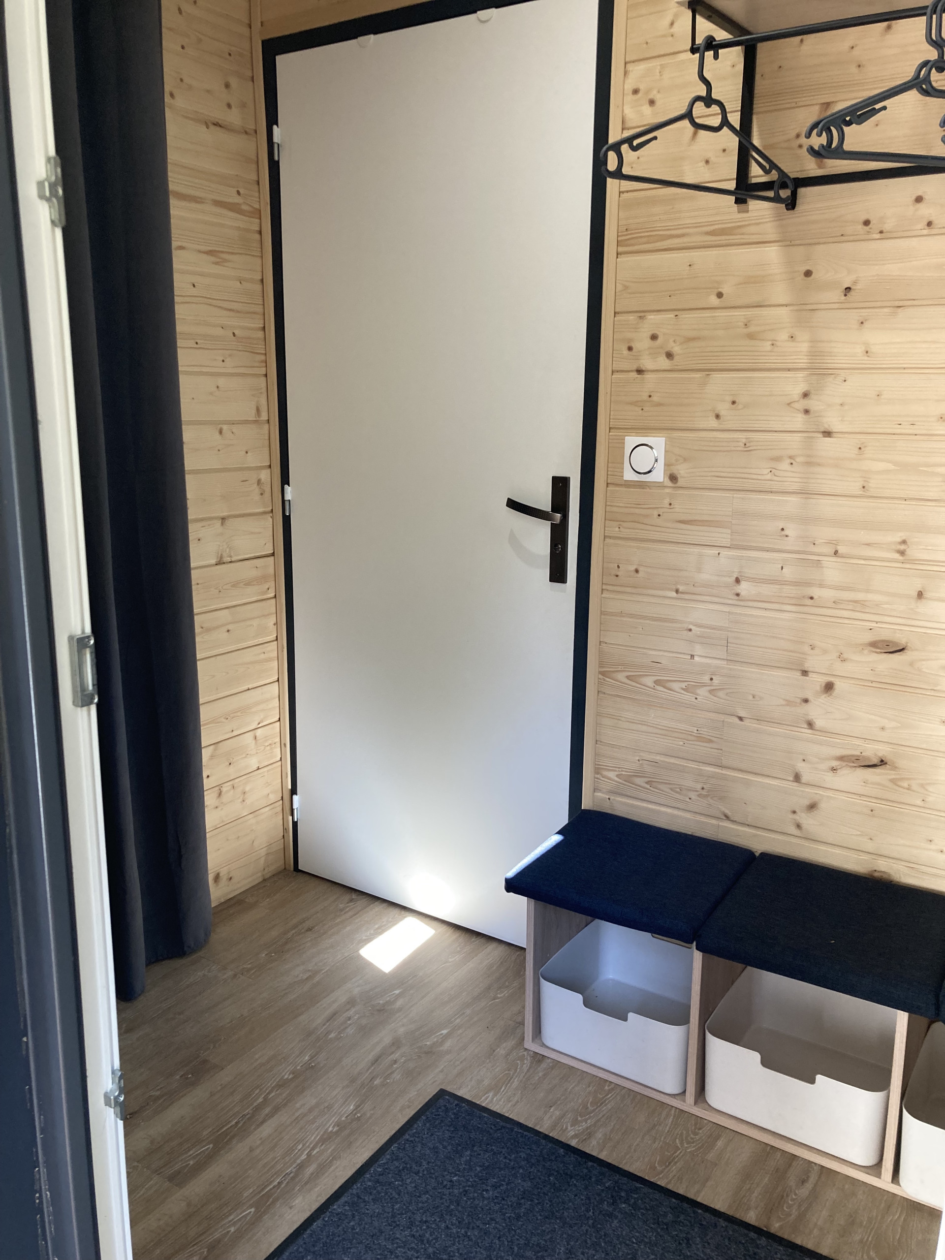 Un coin montagne avec un lit superposé se trouve dans le couloir de l'entrée et pourra retrouver intimité si besoin grâce à un rideau de séparation avec le séjour.