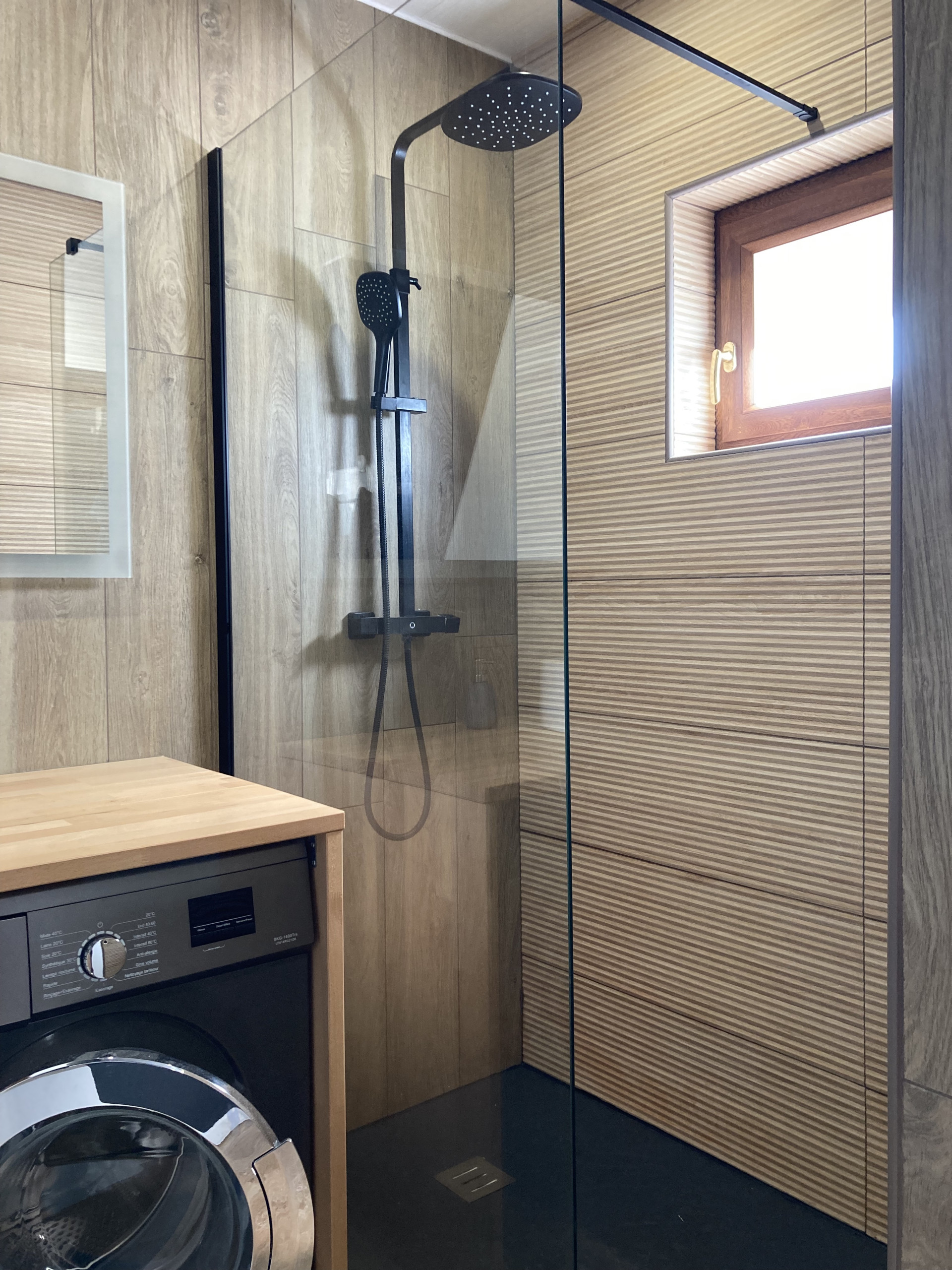 Dans l'entrée de ce logement vous aurez accès à la salle d'eau avec douche et wc ainsi que machine à laver. Un sèche cheveux est présent également.