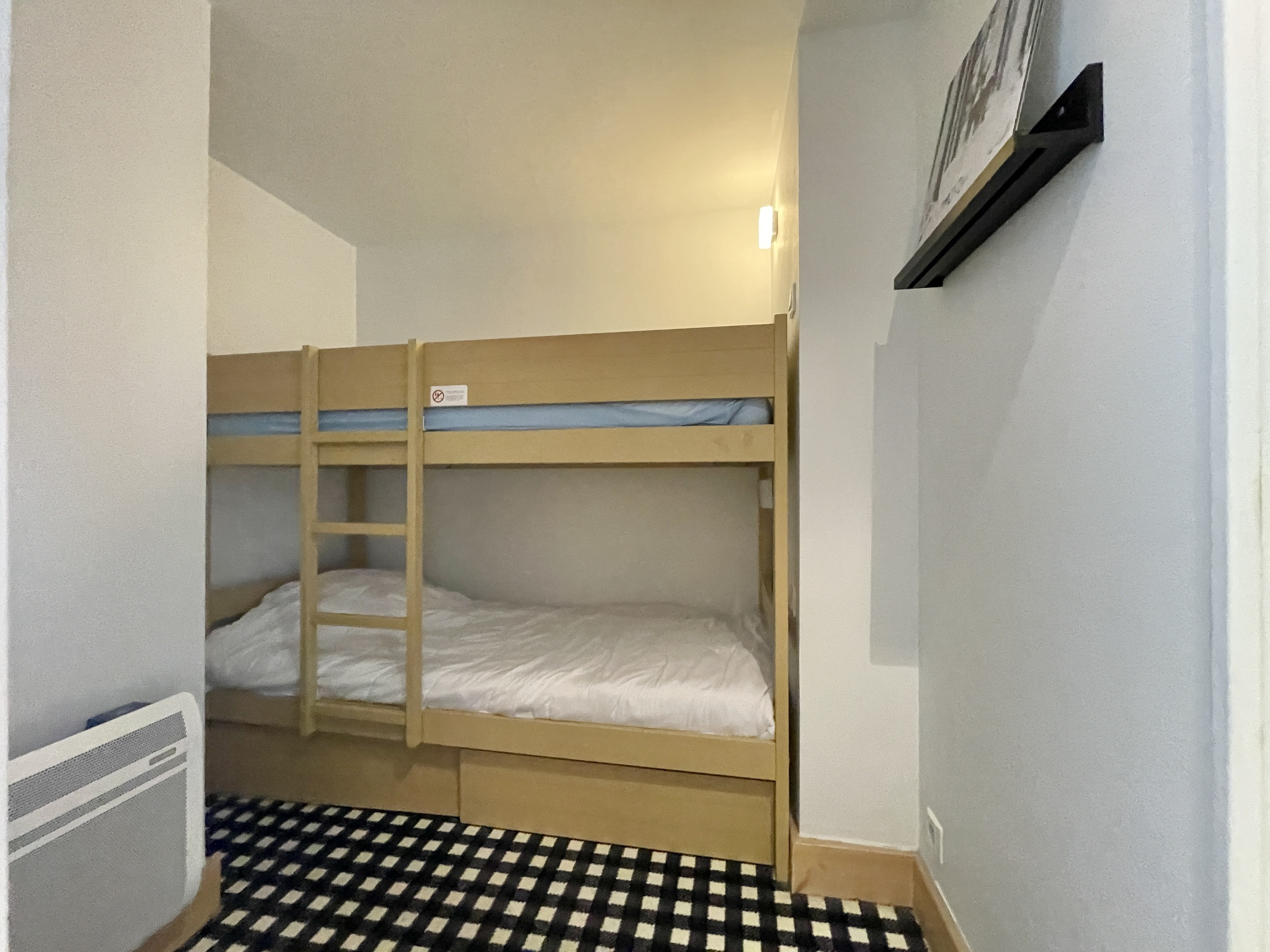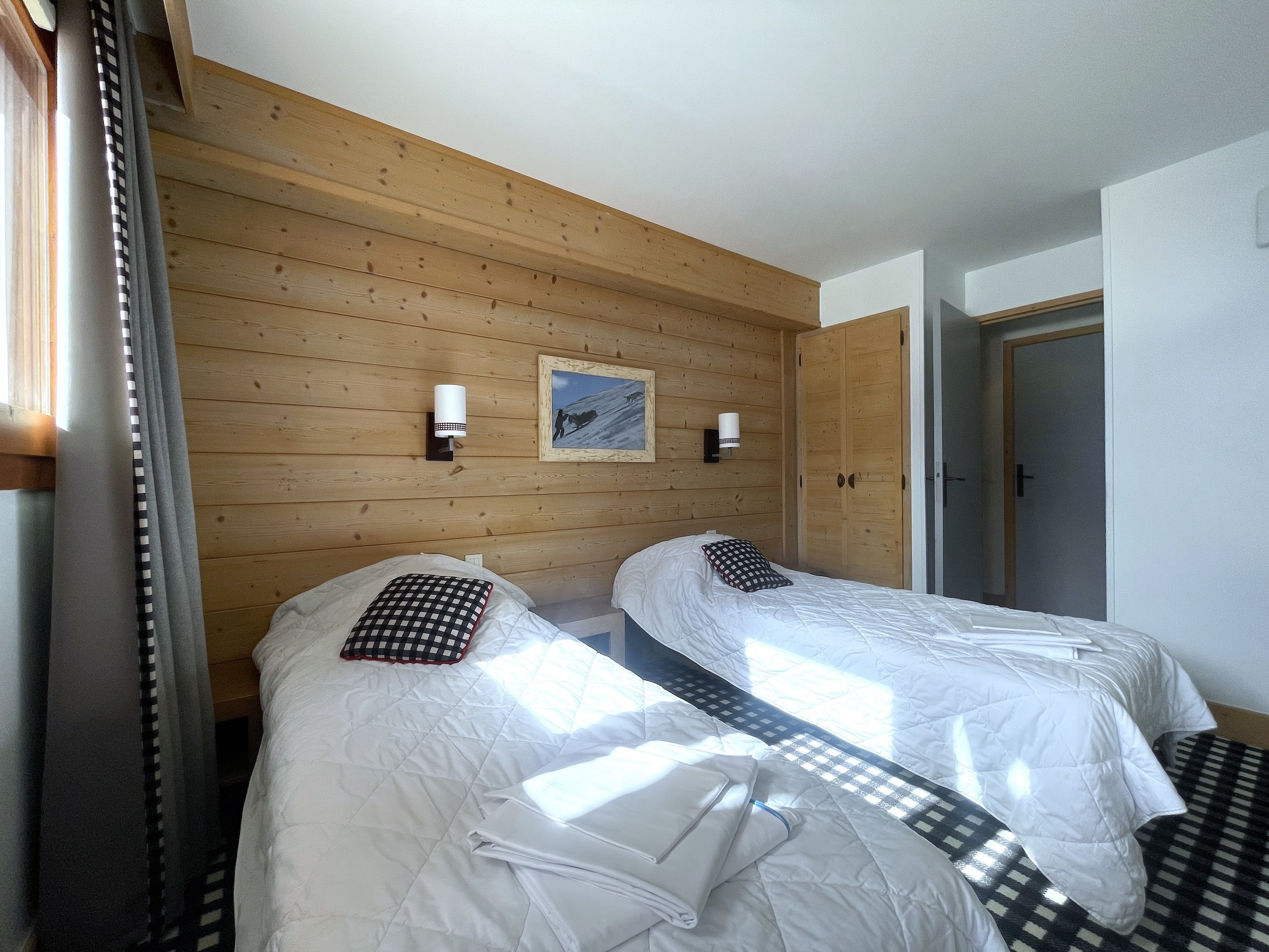 L'appartement dispose de deux chambres et un coin montagne soigneusement aménagés, proposant une variété de couchages : un lit simple et superposé (largeur 80 cm), un lit queen size (160 cm), 2 lits jumeaux (80 cm) et un lit relevable type gigogne (80 cm). Cette configuration permet un agencement flexible et confortable pour les familles de toutes tailles.