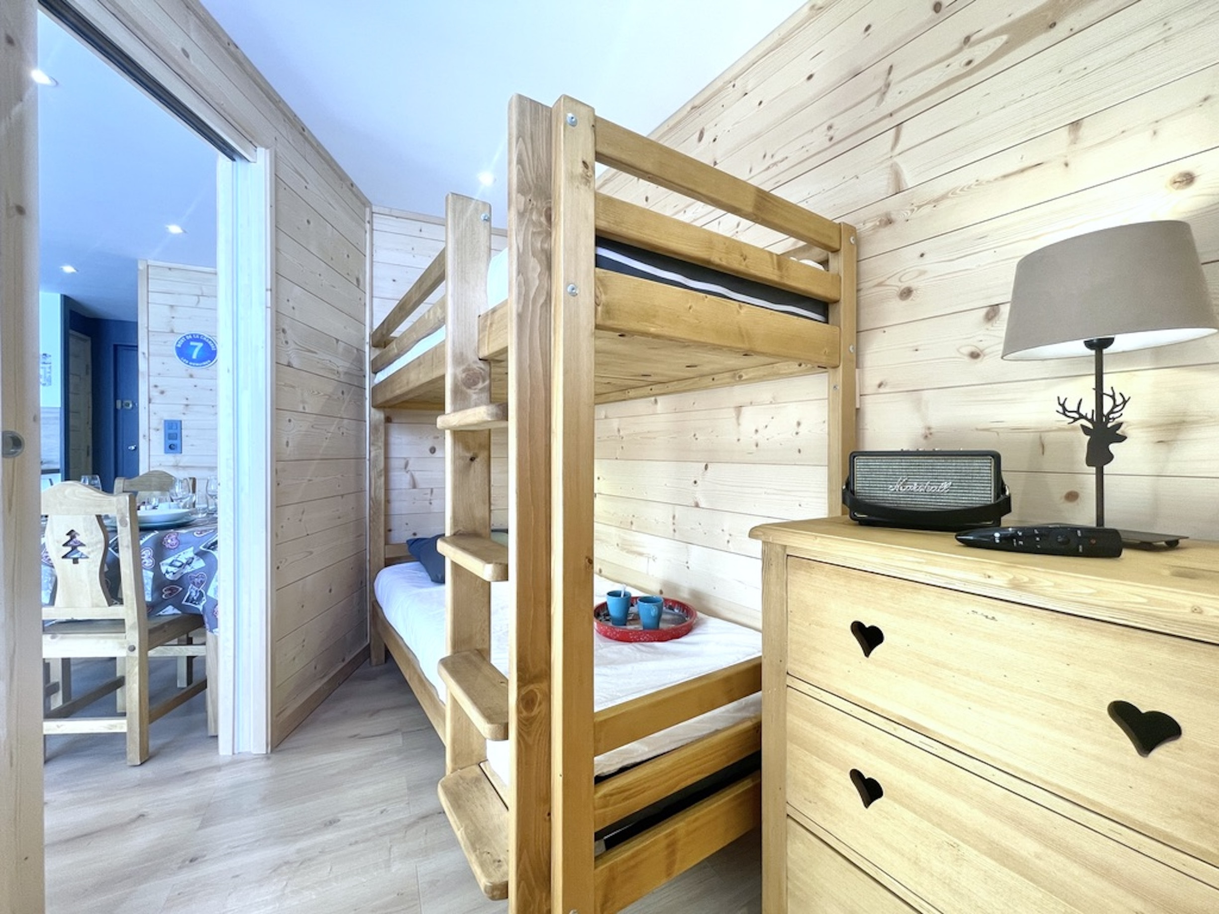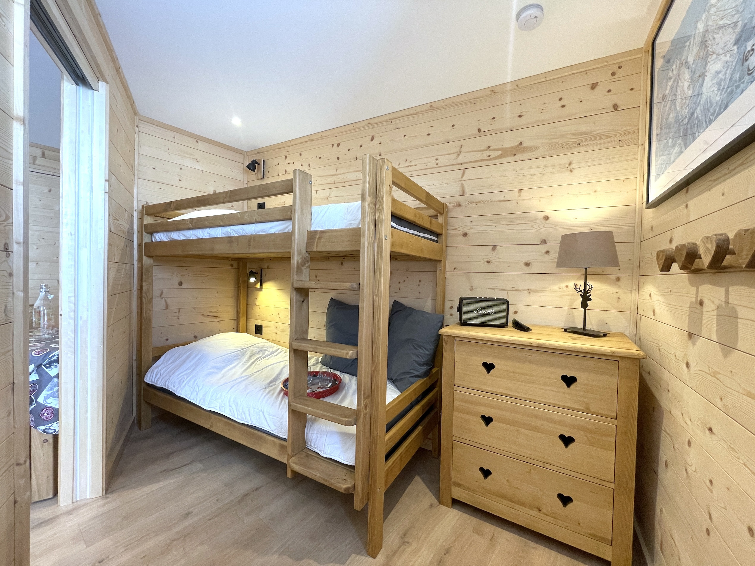 La chambre dispose de lits superposés avec une literie récente et confortable. Une enceinte Bluetooth Marshall est présente pour accompagner vos moments de détente.