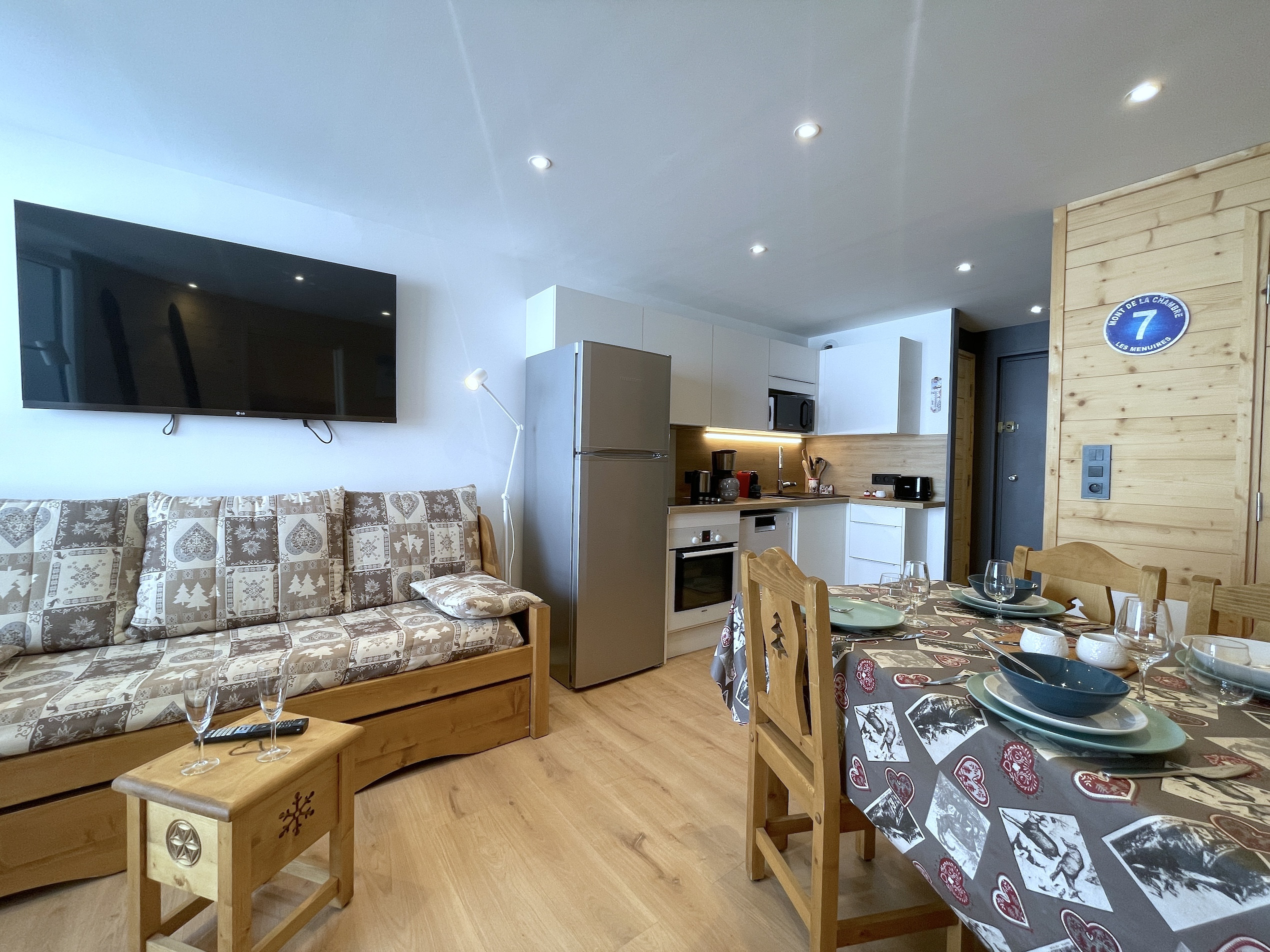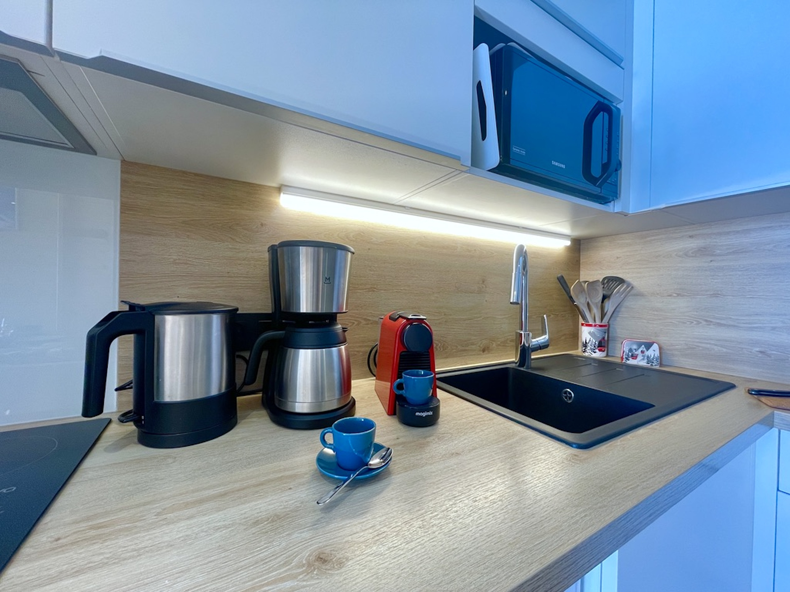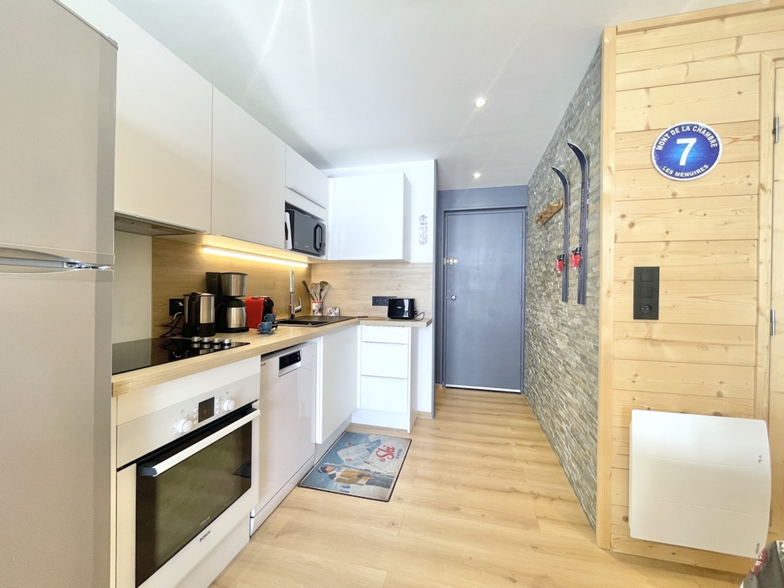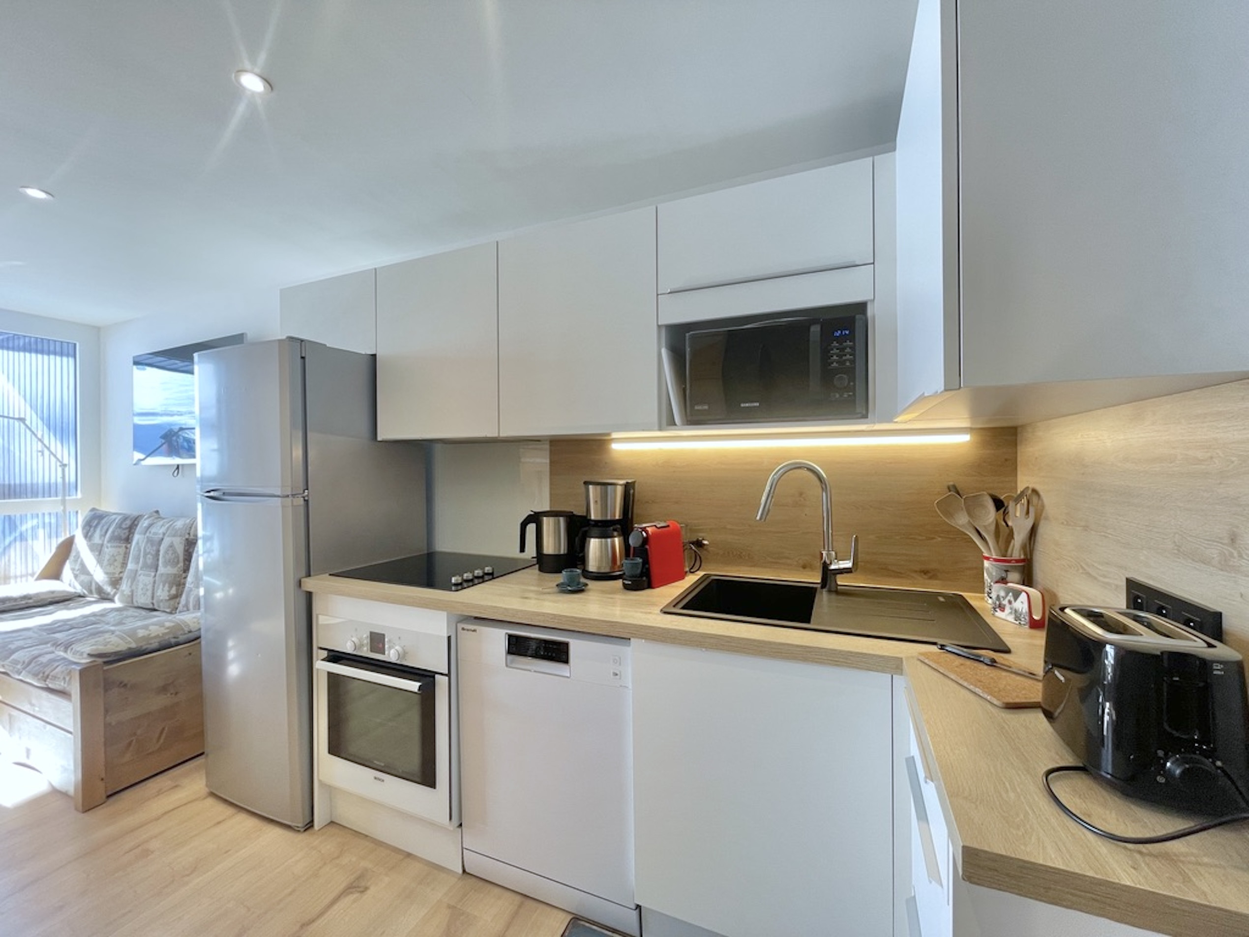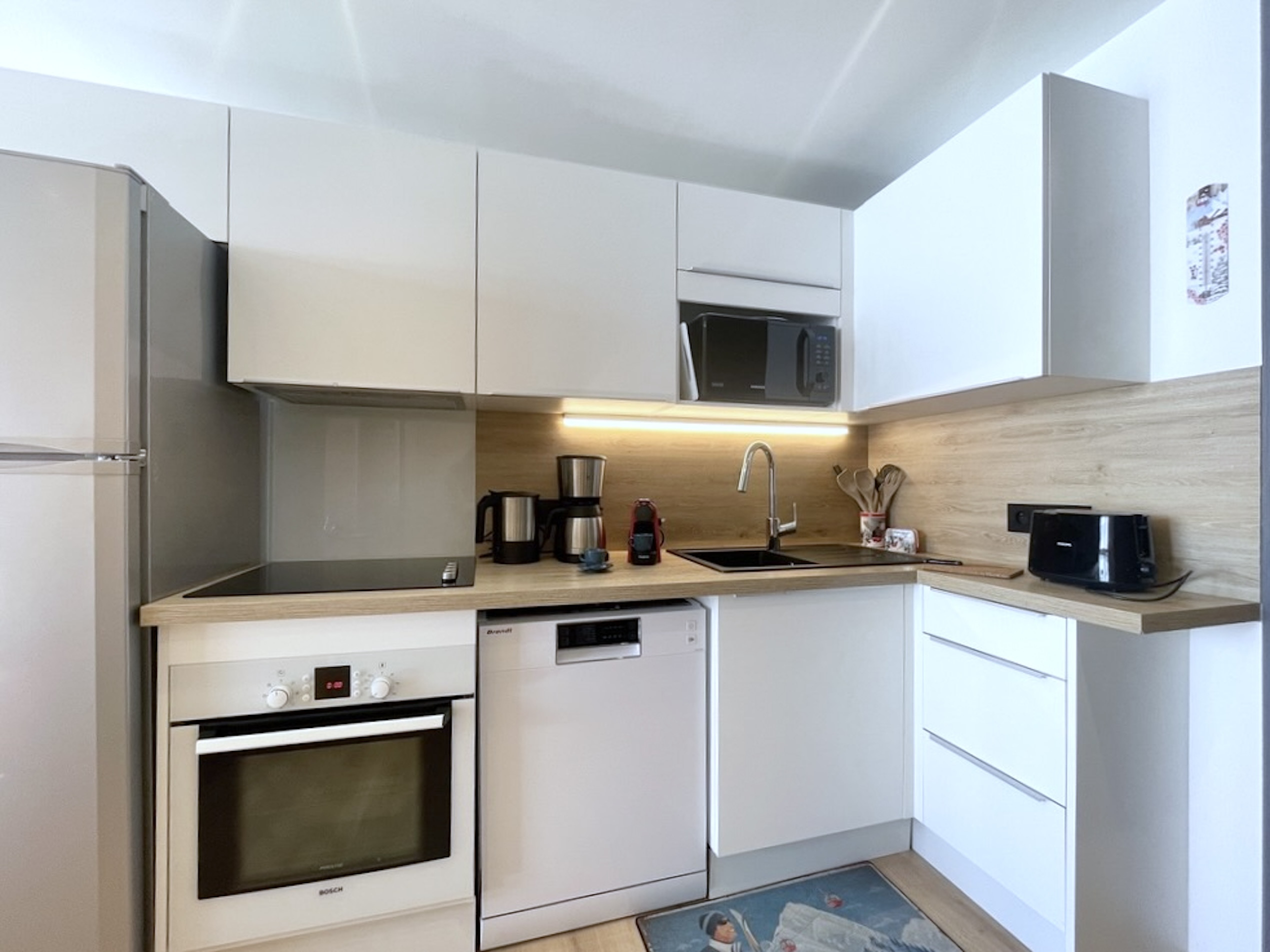 La cuisine, ultra fonctionnelle, est parfaitement équipée pour cuisiner sur place : four traditionnel, lave-vaisselle, grand réfrigérateur avec congélateur, micro-ondes, cafetières (Nespresso et filtre), bouilloire, grille-pain. Un appareil à raclette est également à disposition pour profiter de soirées conviviales autour des spécialités savoyardes.