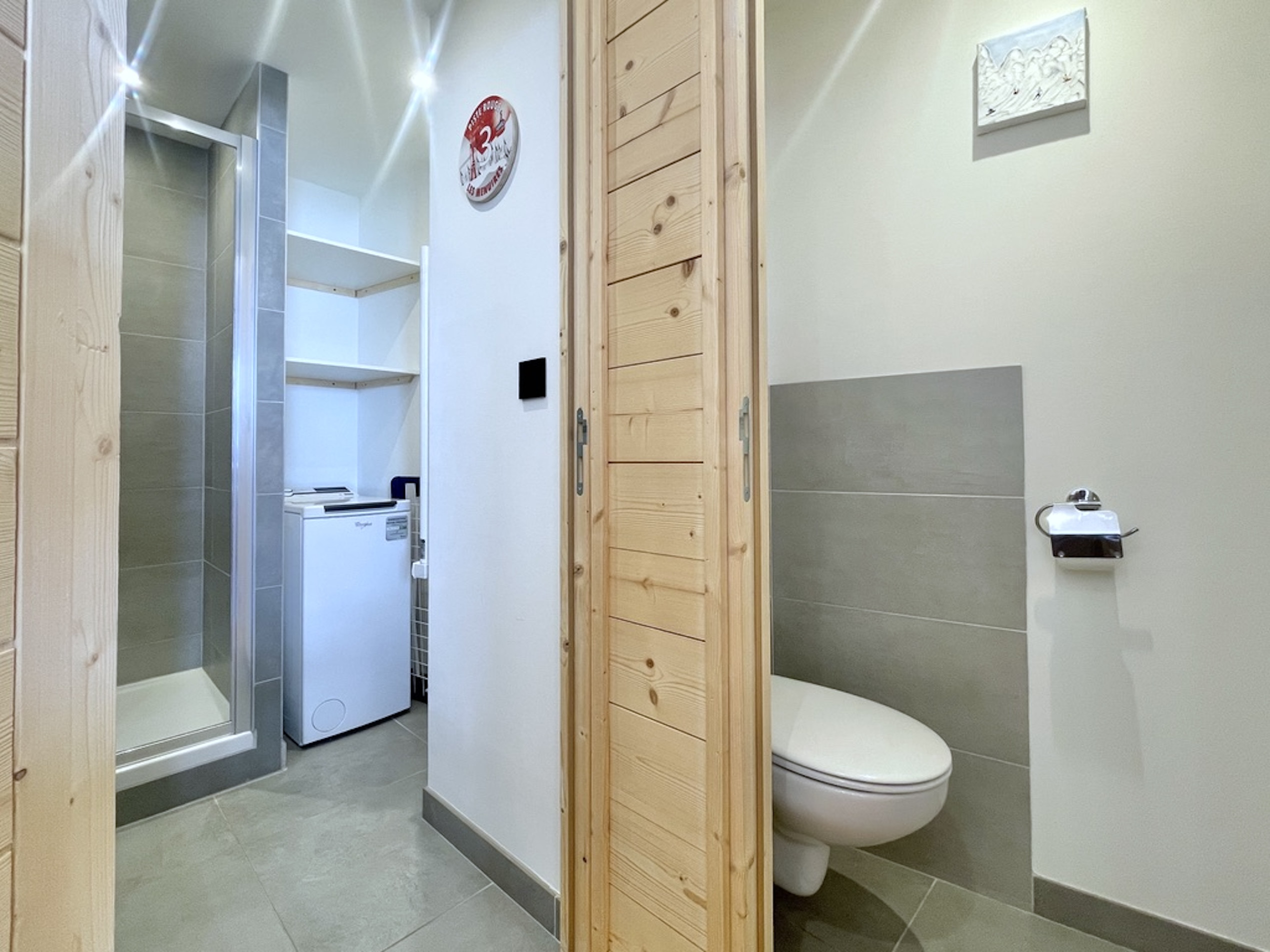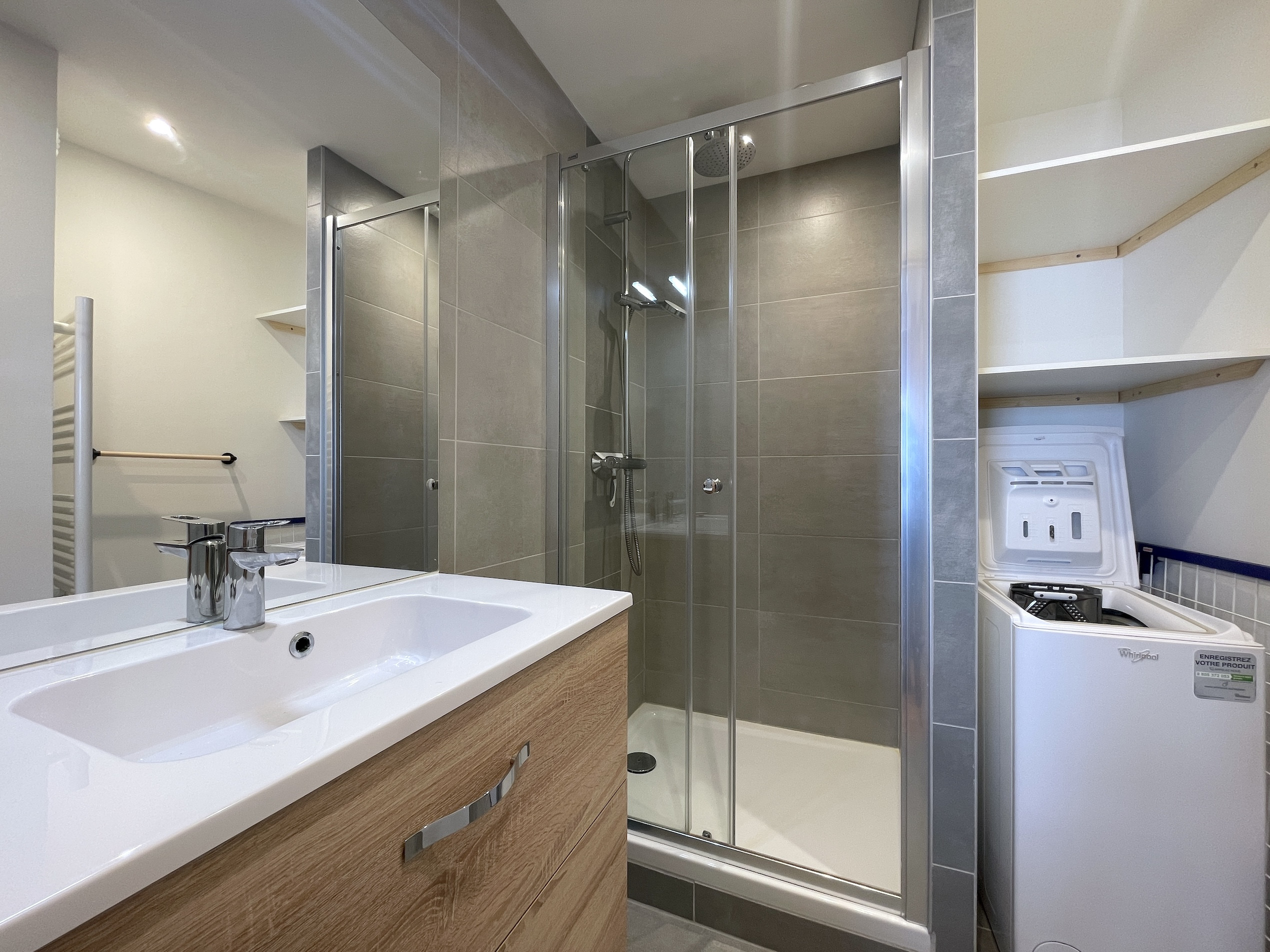 La salle de bain propose une grande douche moderne, d’un radiateur sèche-serviettes et une machine à laver.