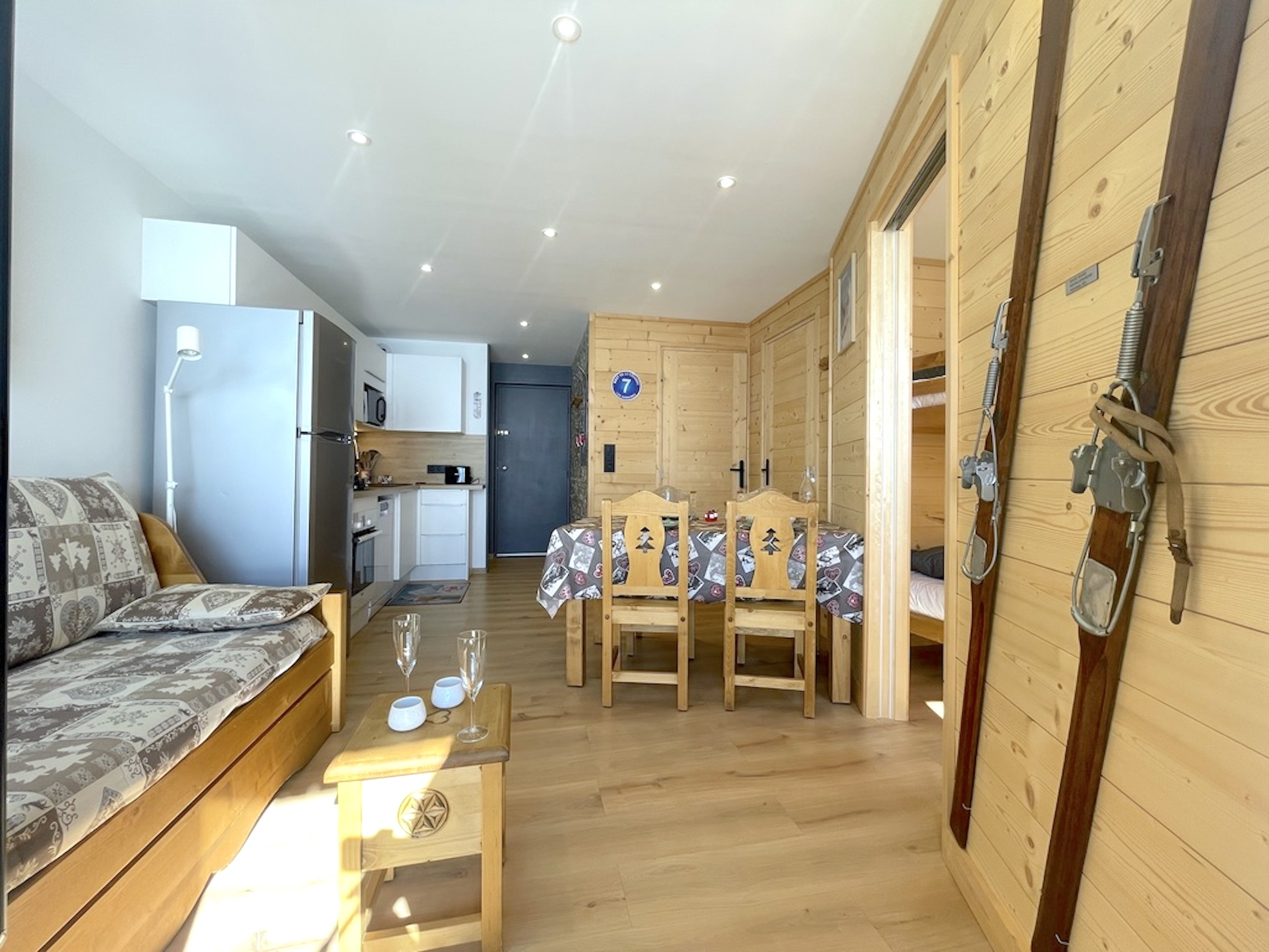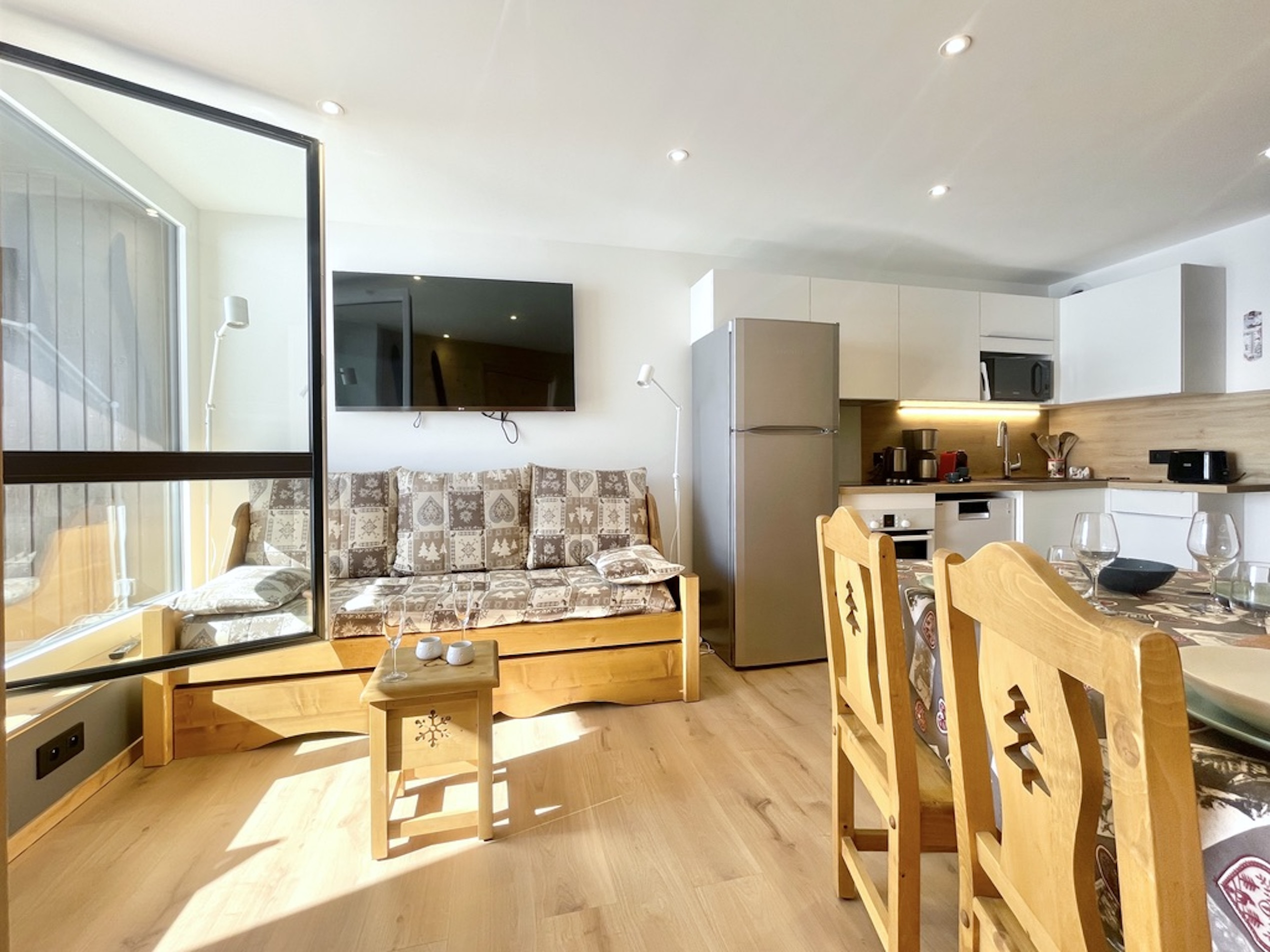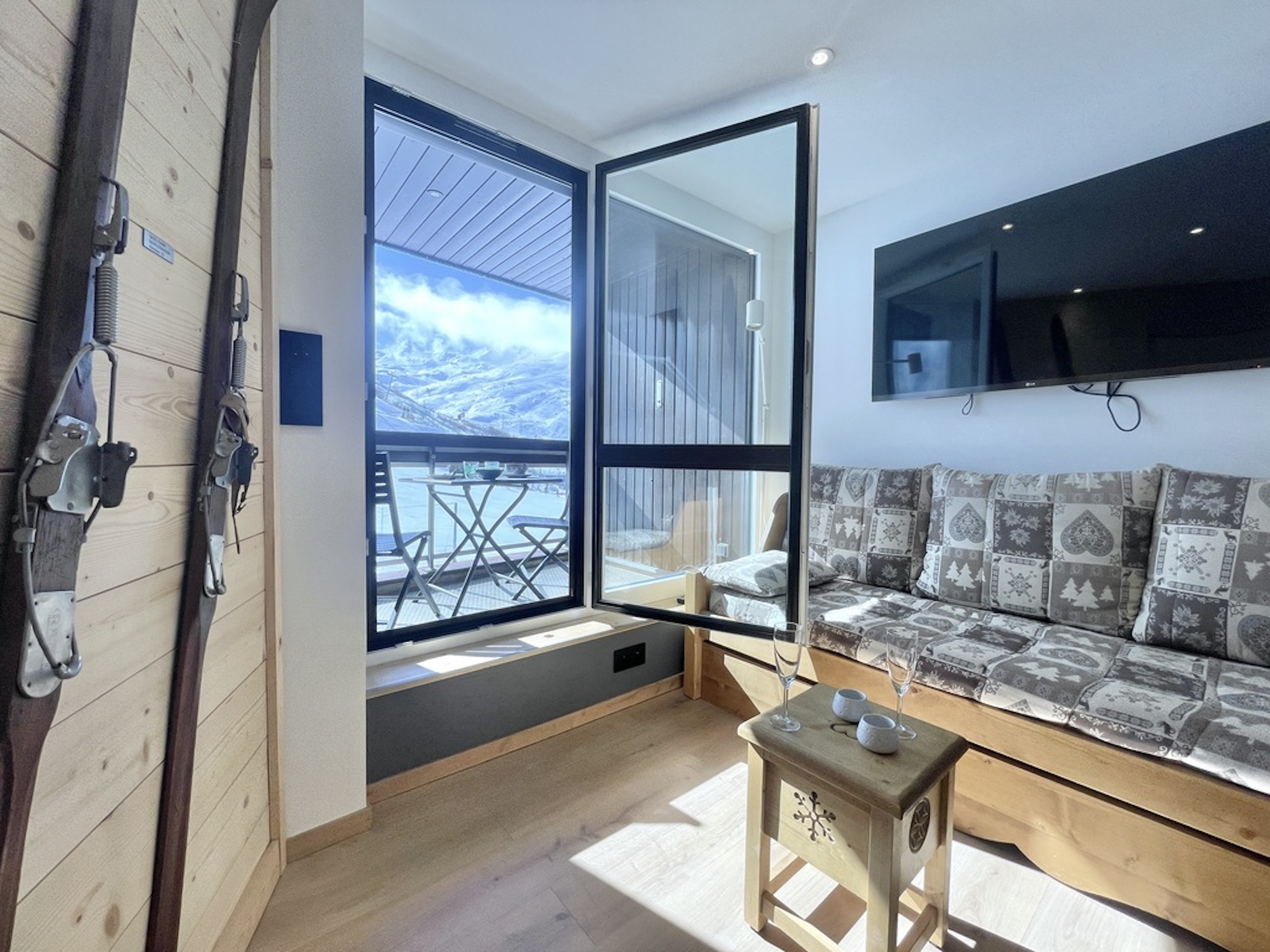 Deux pièces entièrement rénové au style alpin moderne, très soigné, avec départ skis aux pieds. Idéal pour 4 personnes, il offre un balcon plein sud, une vue exceptionnelle sur les montagnes, un parking privatif avec borne électrique et des prestations de qualité.