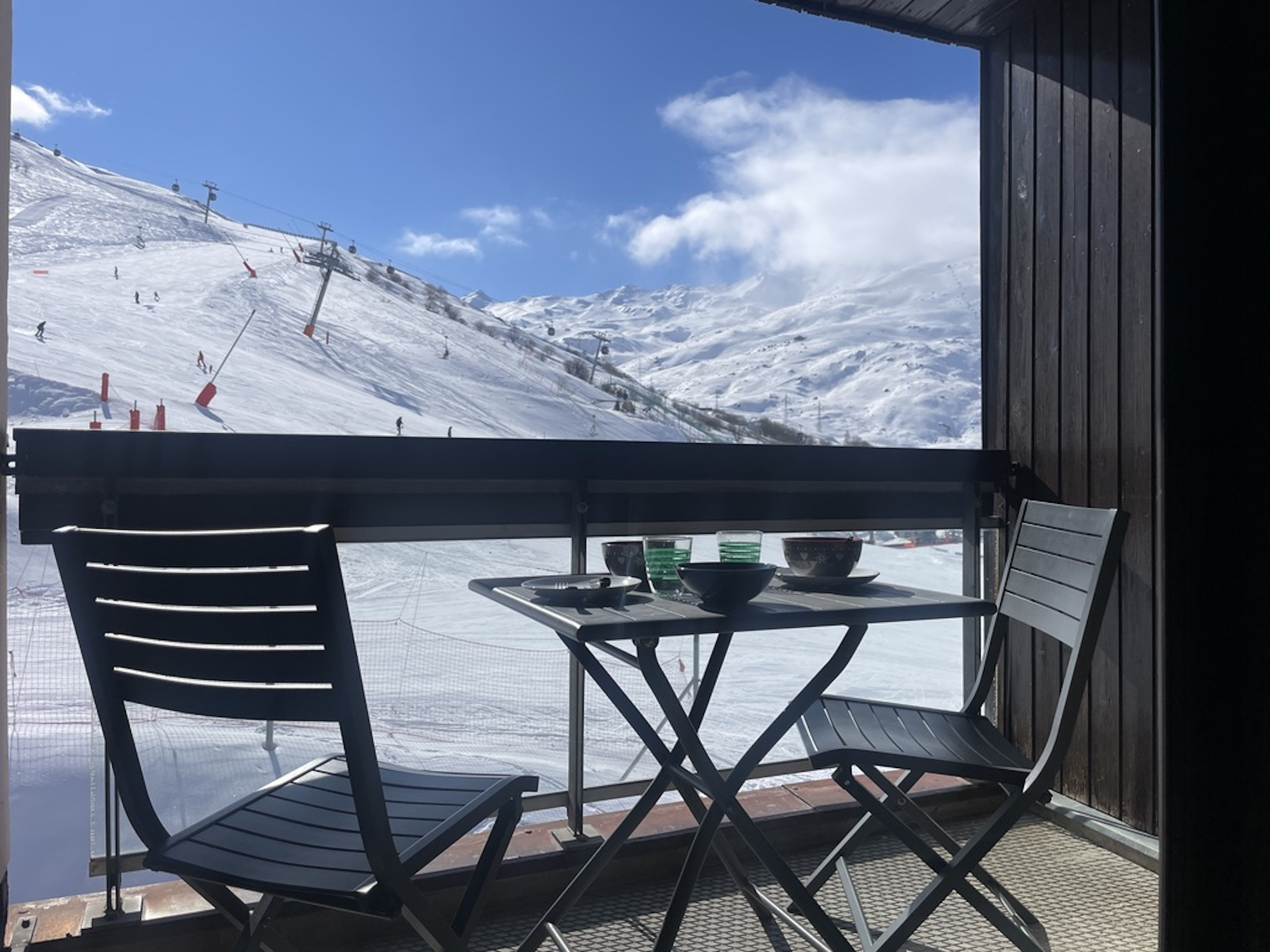 À l’extérieur, le balcon exposé plein sud est un véritable atout : il offre une vue dégagée sur les montagnes et les pistes permettant de profiter du soleil tout au long de la journée, y compris pour les repas grâce à son salon de jardin.