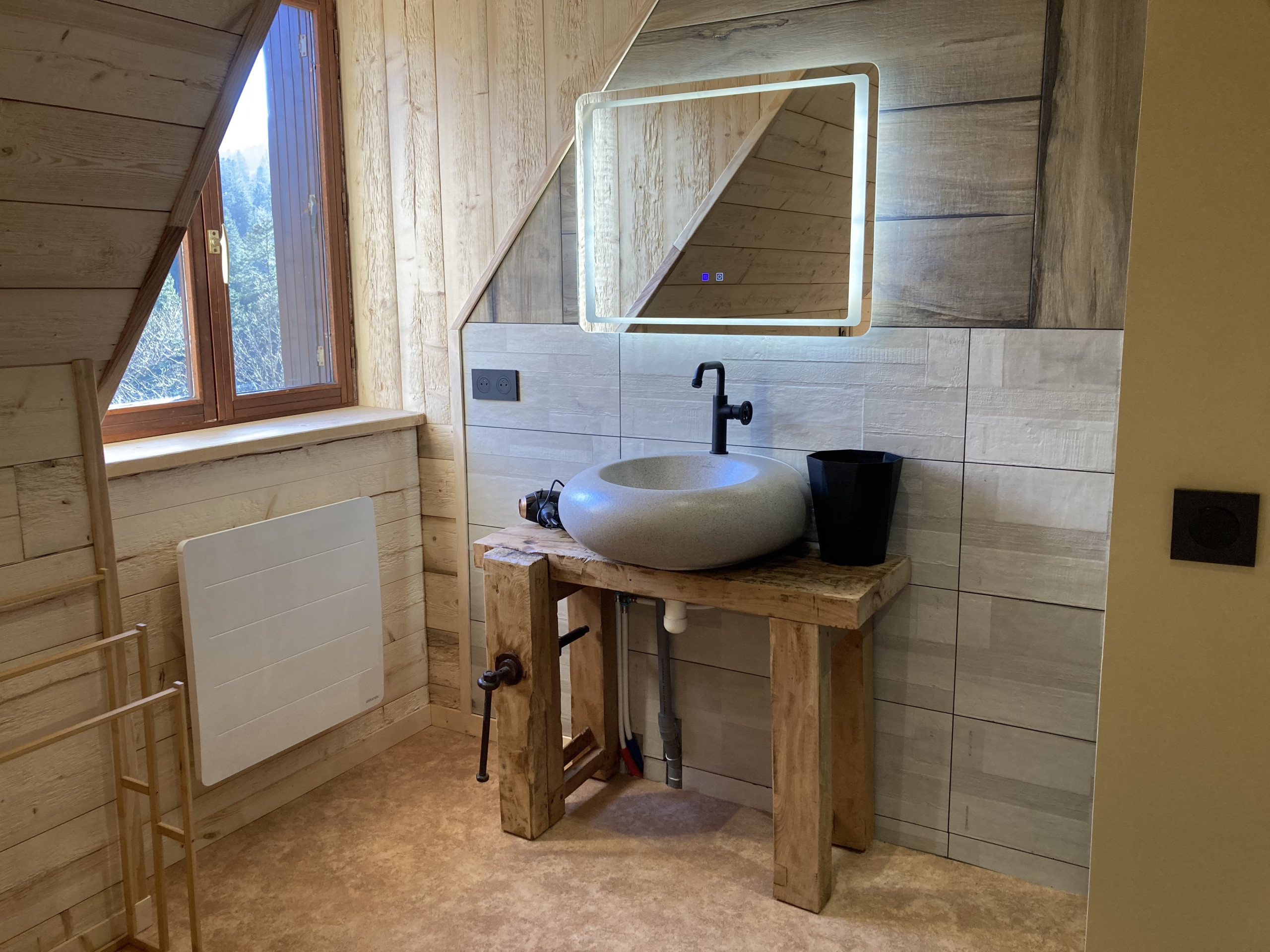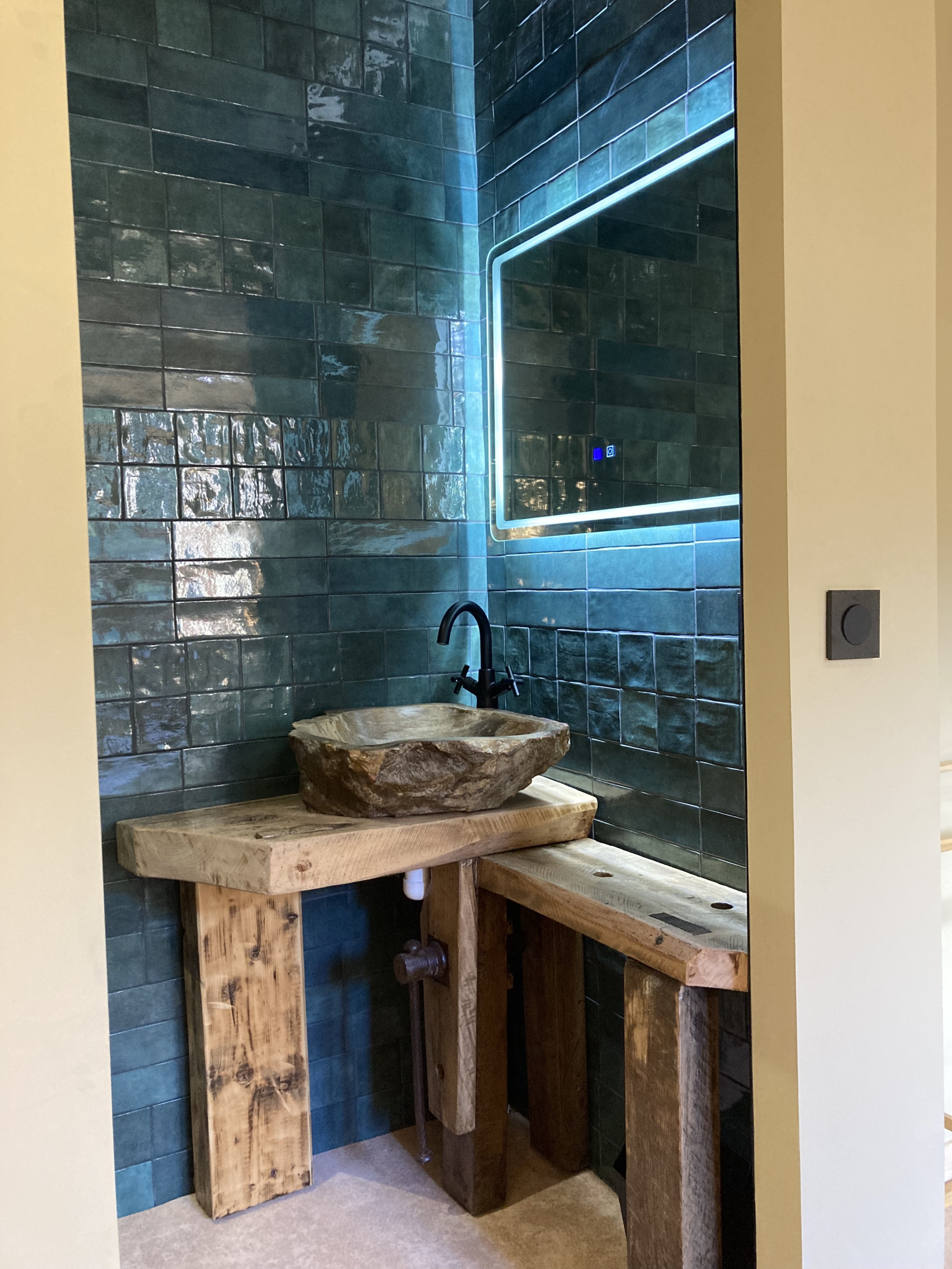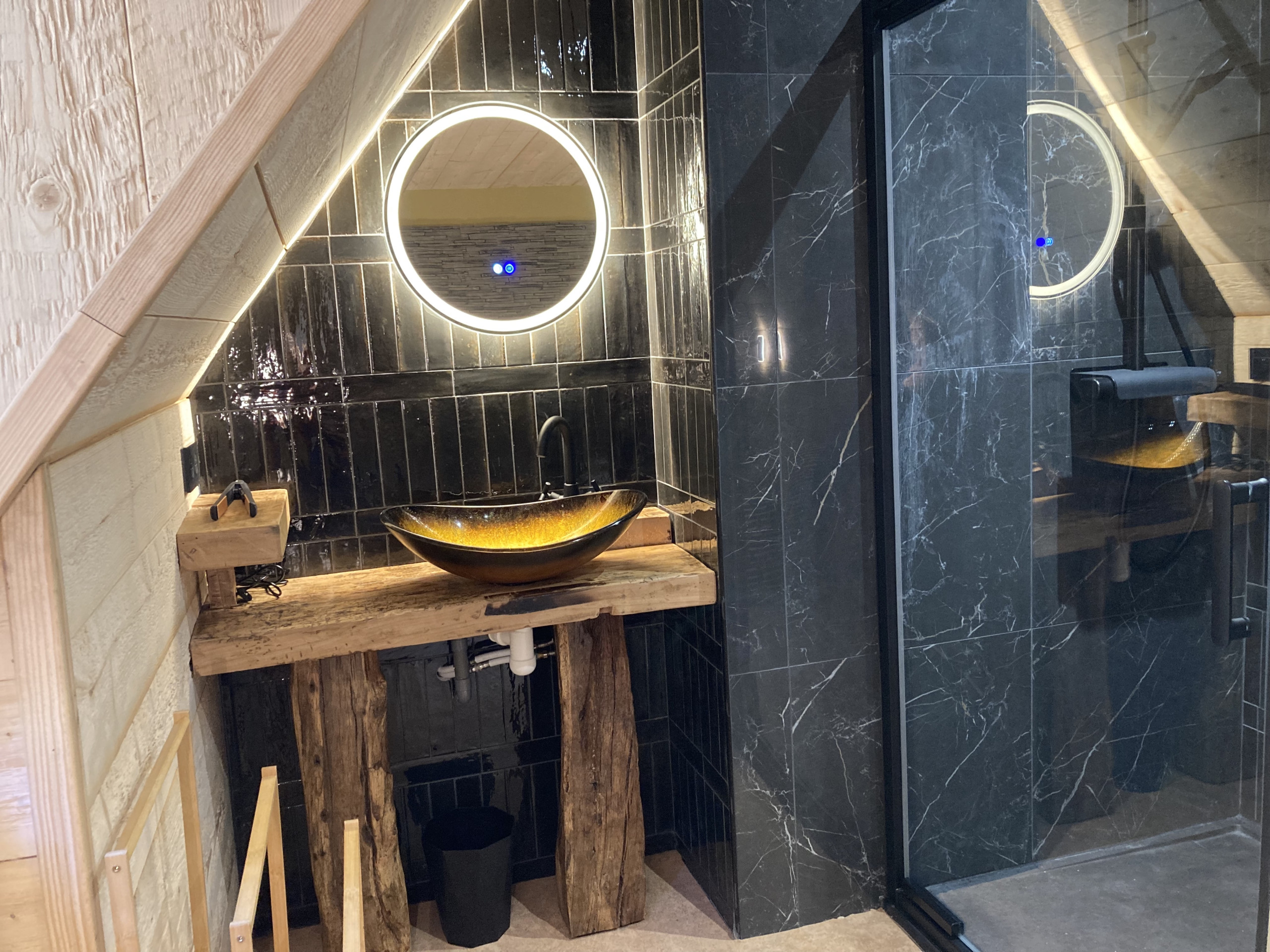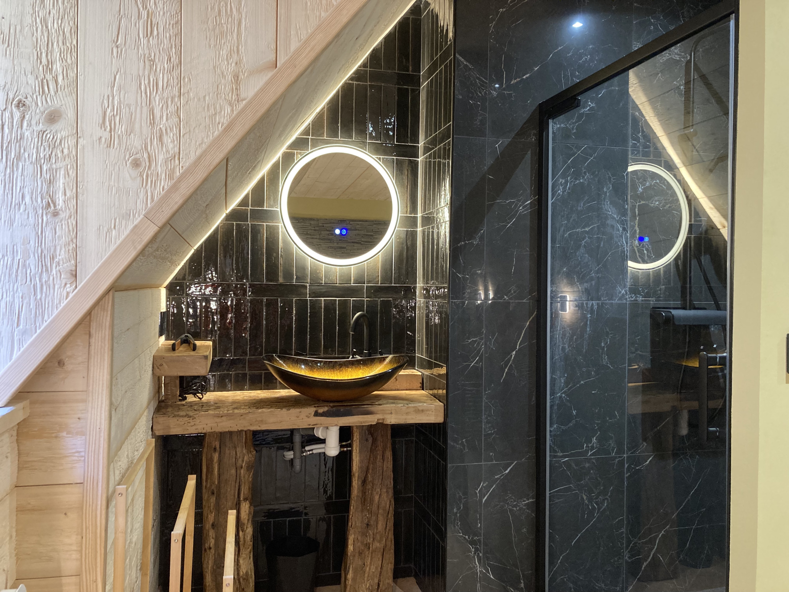 Enfin sur ce niveau vous trouverez un premier wc indépendant et une première chambre (la piste bleu) avec un lit double en 160x200, sa salle de bain privative avec douche, baignoire à jet et une décoration dans l'esprit 'bien-être' absolu.