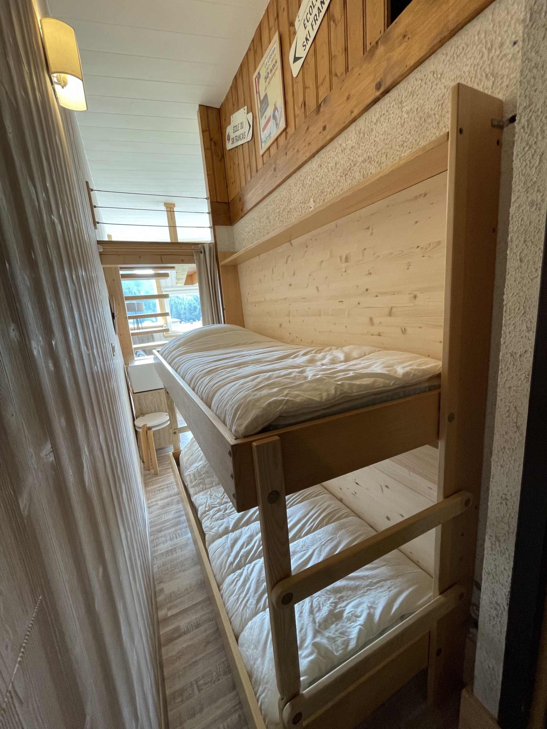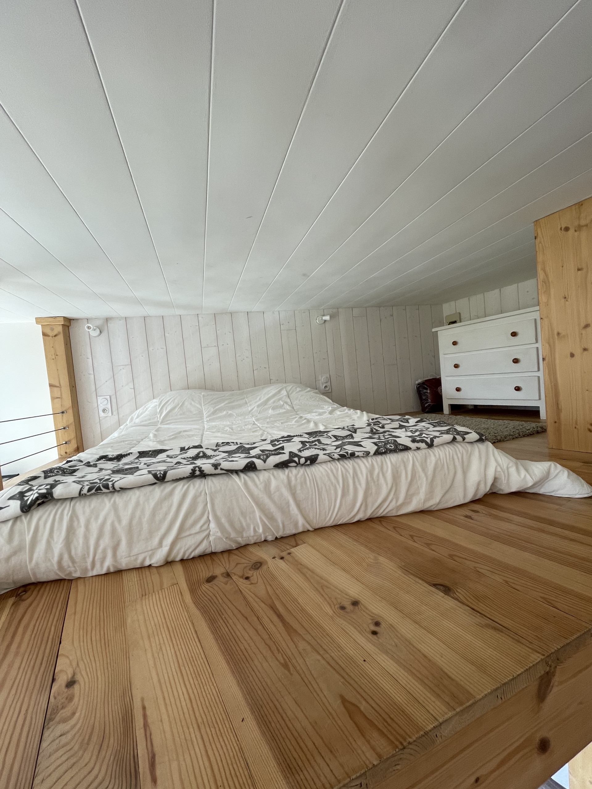 Au niveau de la mezzanine se trouve le coin nuit avec un lit double. Le lit superposé se situe dans le couloir, ce dernier vous donne également accès à la salle d'eau qui est constitué d'une douche et d'un WC.