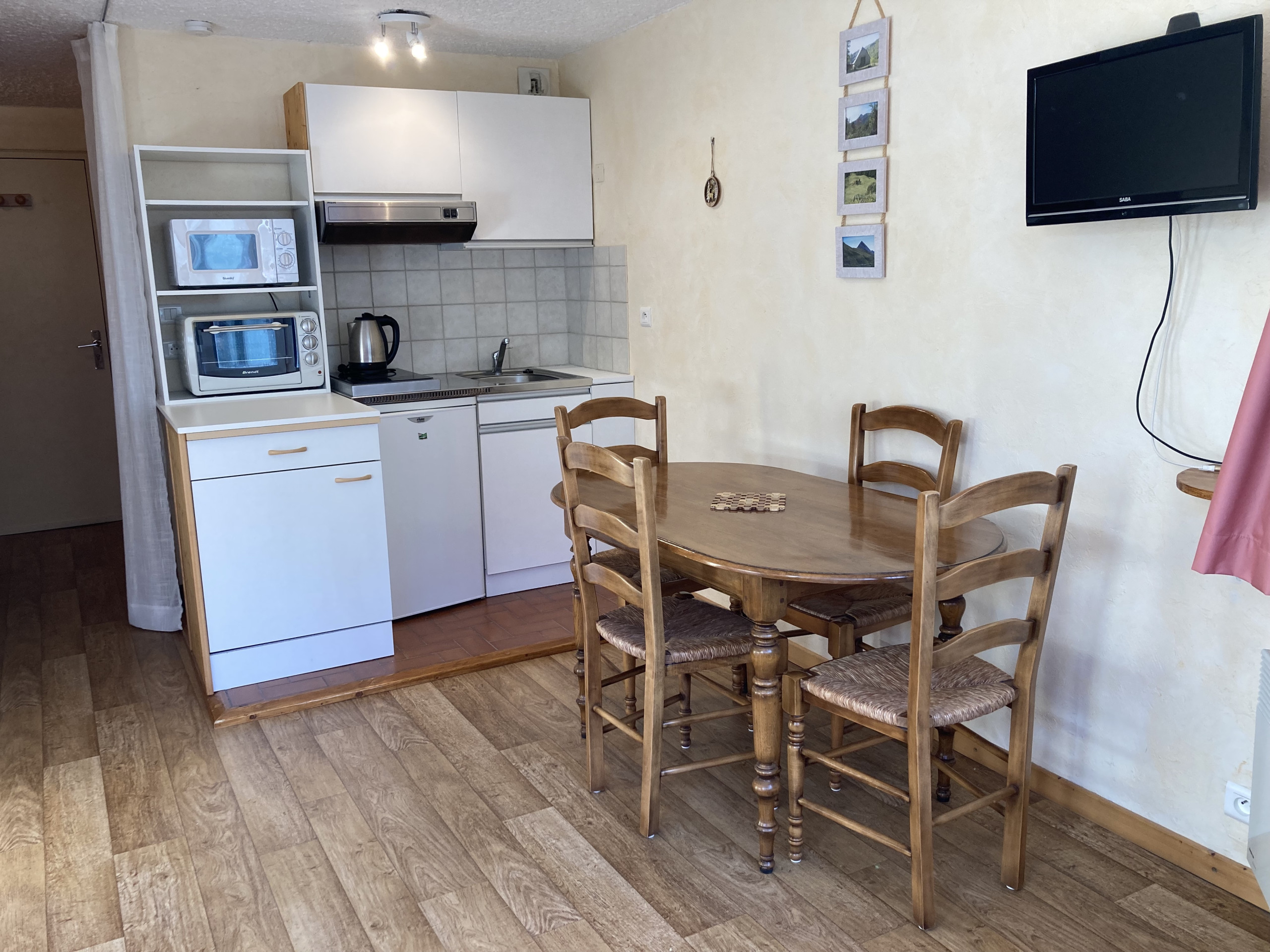 Un espace salon cuisine ouverte vous permettra de passer les moments de vie quotidienne confortablement. Le canapé y est convertible en 140x190.