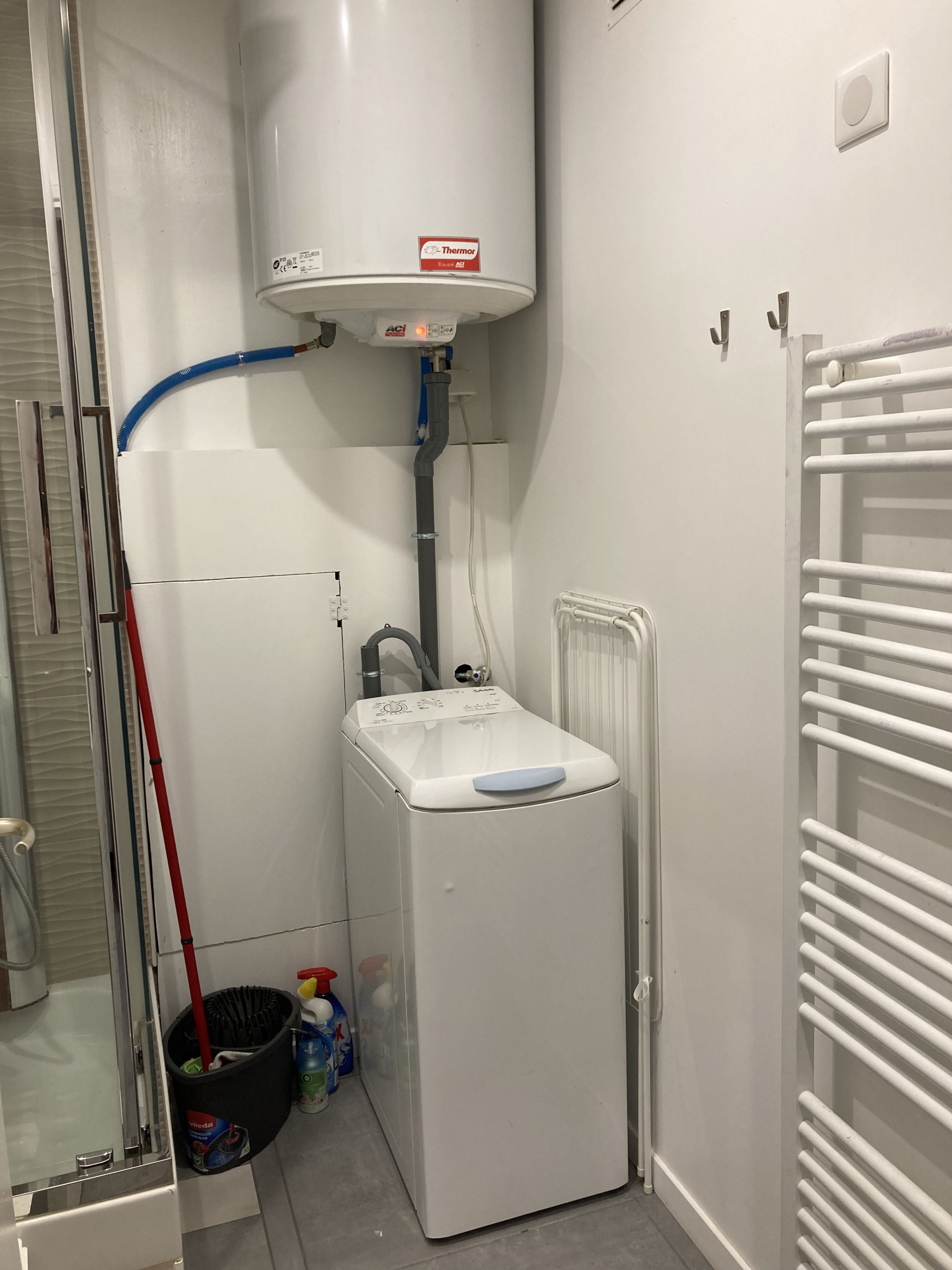 Vous trouverez dans l'entrée un placard de rangement avec aspirateur et fer à repasser.