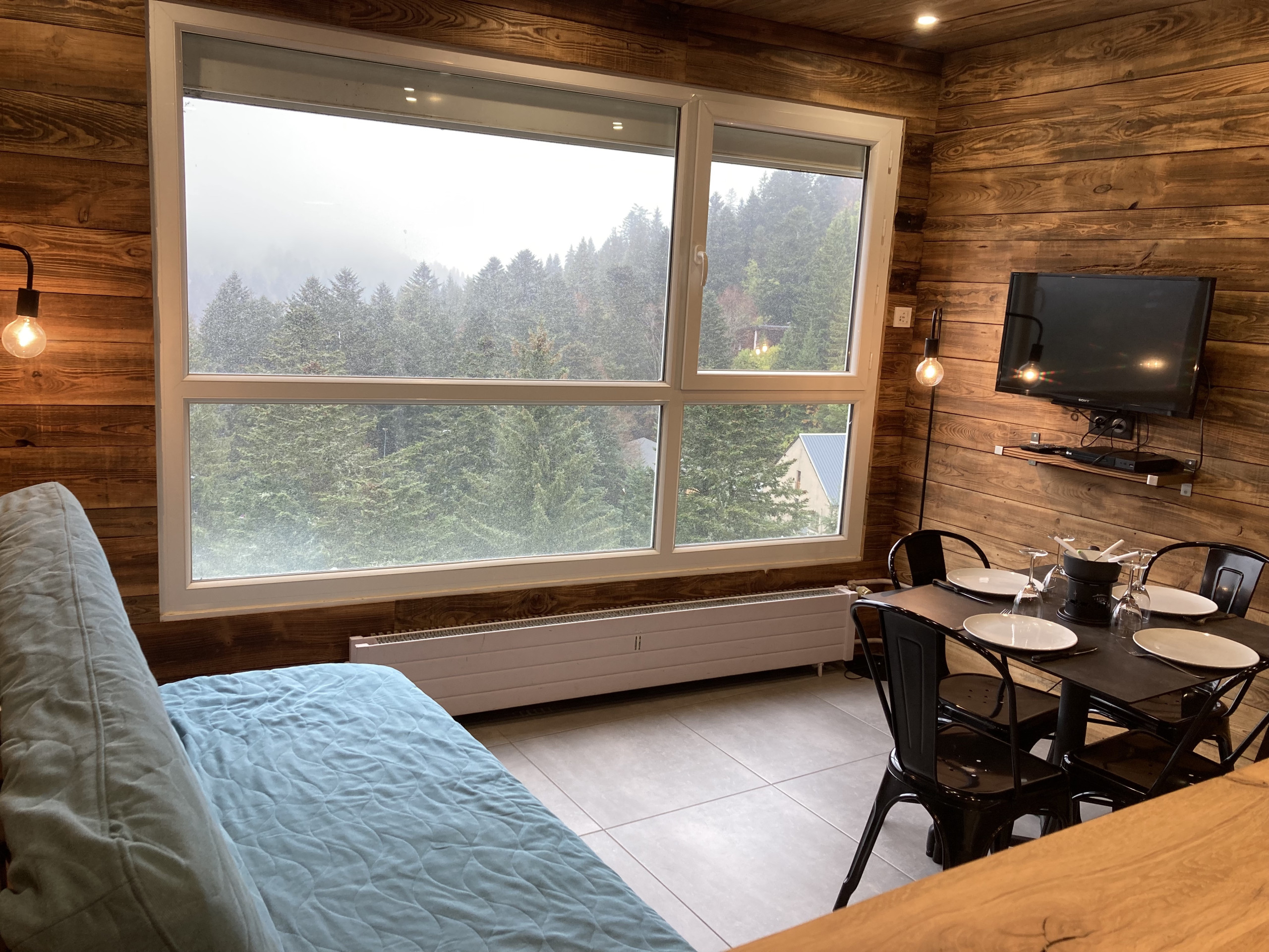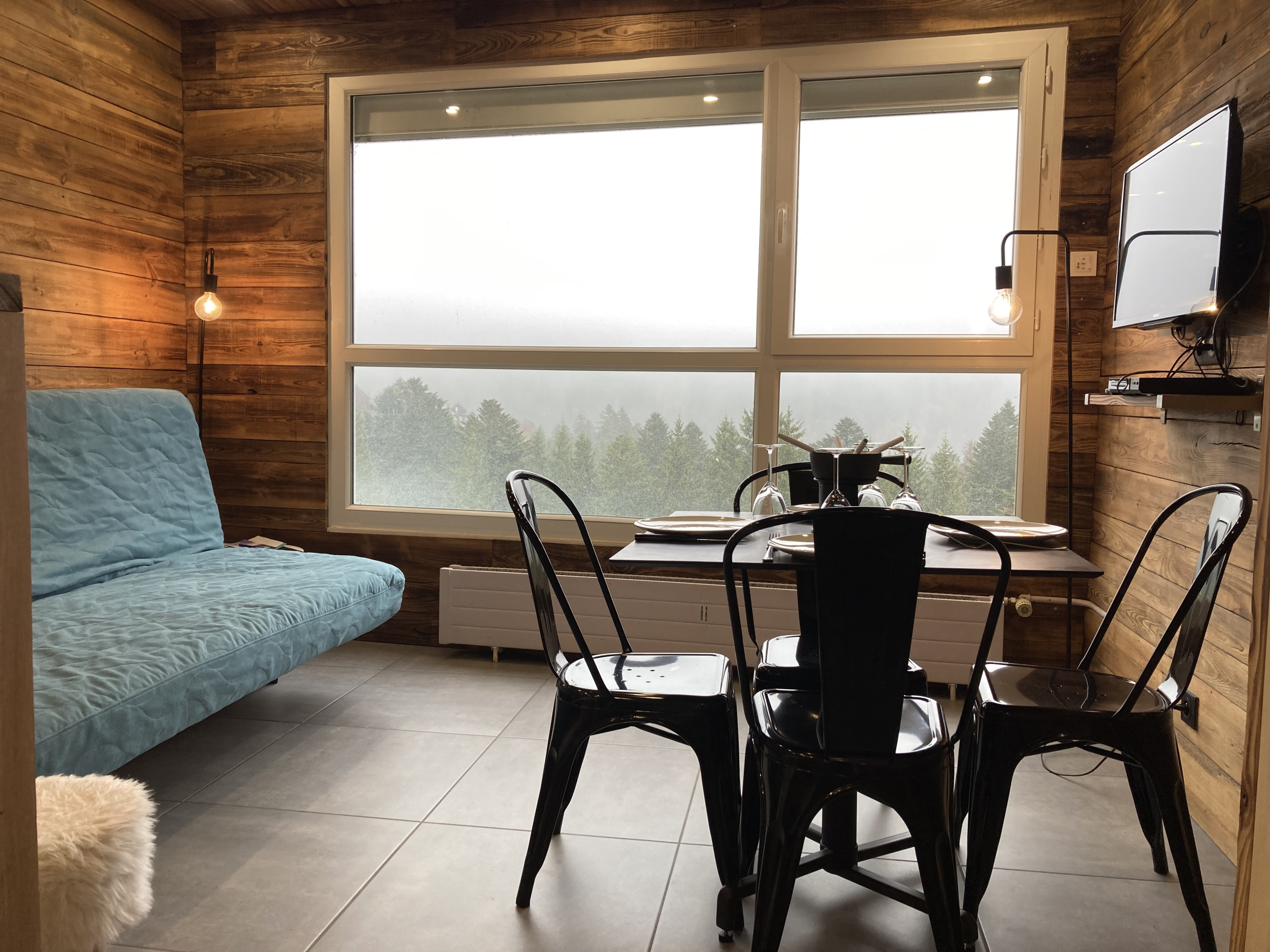 Le Salon est ouvert sur le coin cuisine et vous offrira une vue sur les montagnes du bec de l'aigle et du téton de venus (coté parking). Vous aurez à votre disposition un canapé convertible type clic-clac en 140x190.