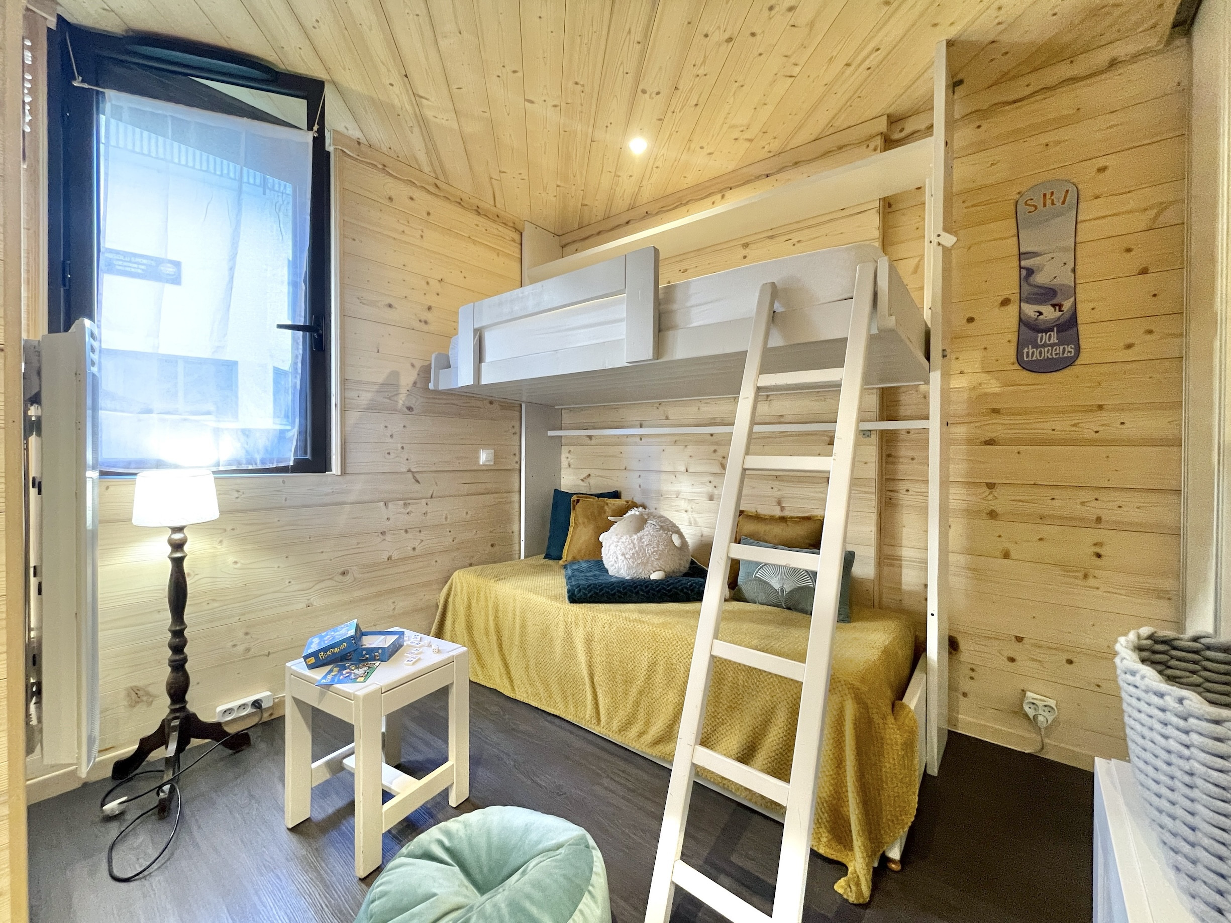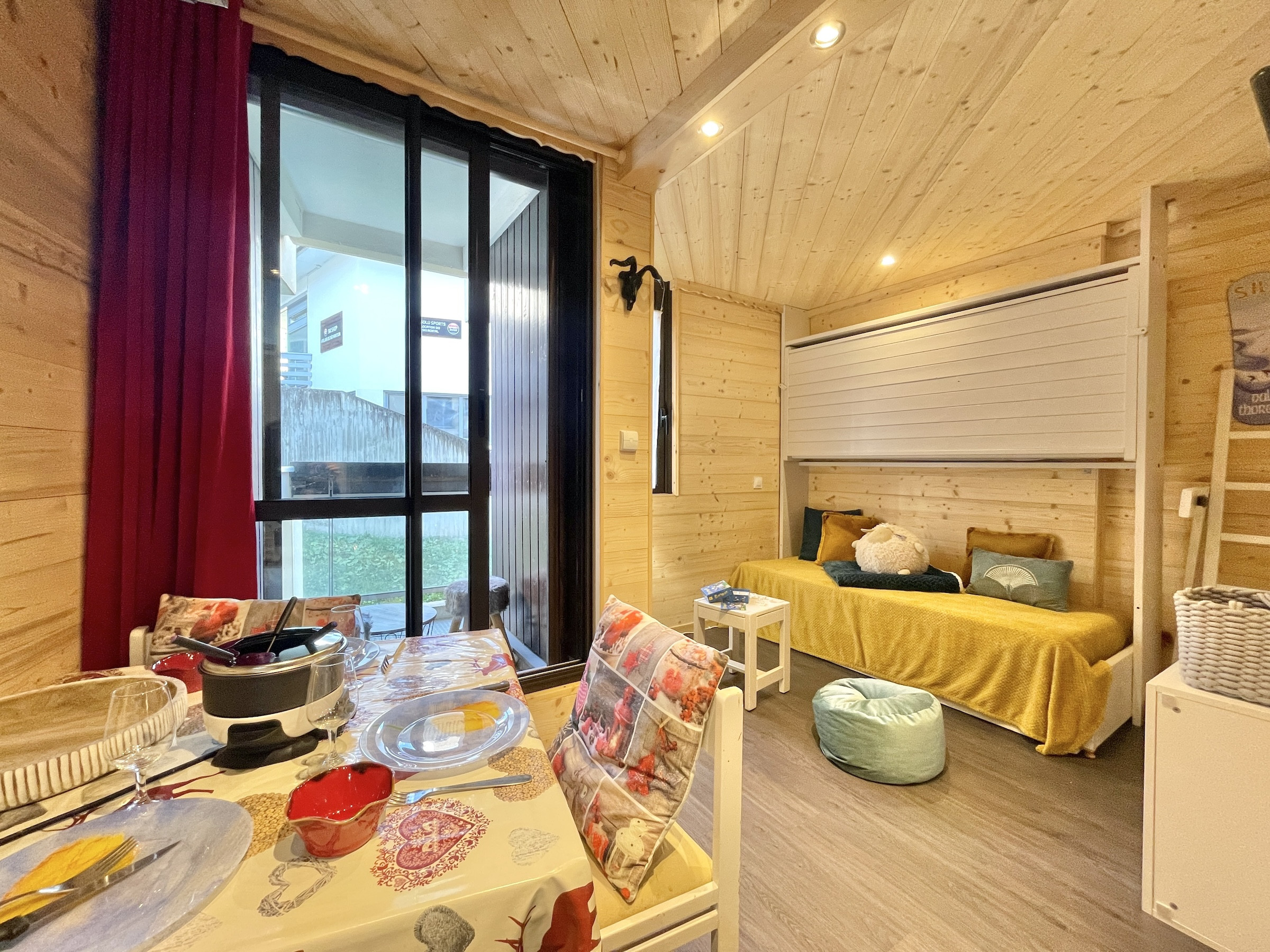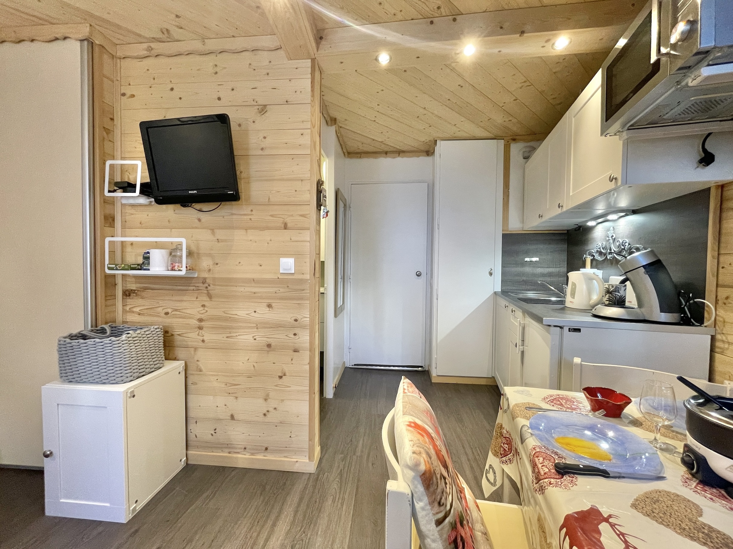 Il dispose d'un aménagement intelligent offrant des couchages confortable pour 3 personnes, avec un lit superposé (largeur 80 cm) et un canapé-lit (largeur 80 cm), ainsi qu'un lit gigogne relevable (largeur 80 cm) . La cuisinette est entièrement équipée et vous permettra de préparer de délicieux repas après une journée intense sur les pistes. Vous y trouverez un réfrigérateur, des plaques vitro céramiques, un micro-ondes combi grill, une cafetière, une bouilloire, un grille-pain et tous les ustensiles nécessaires.