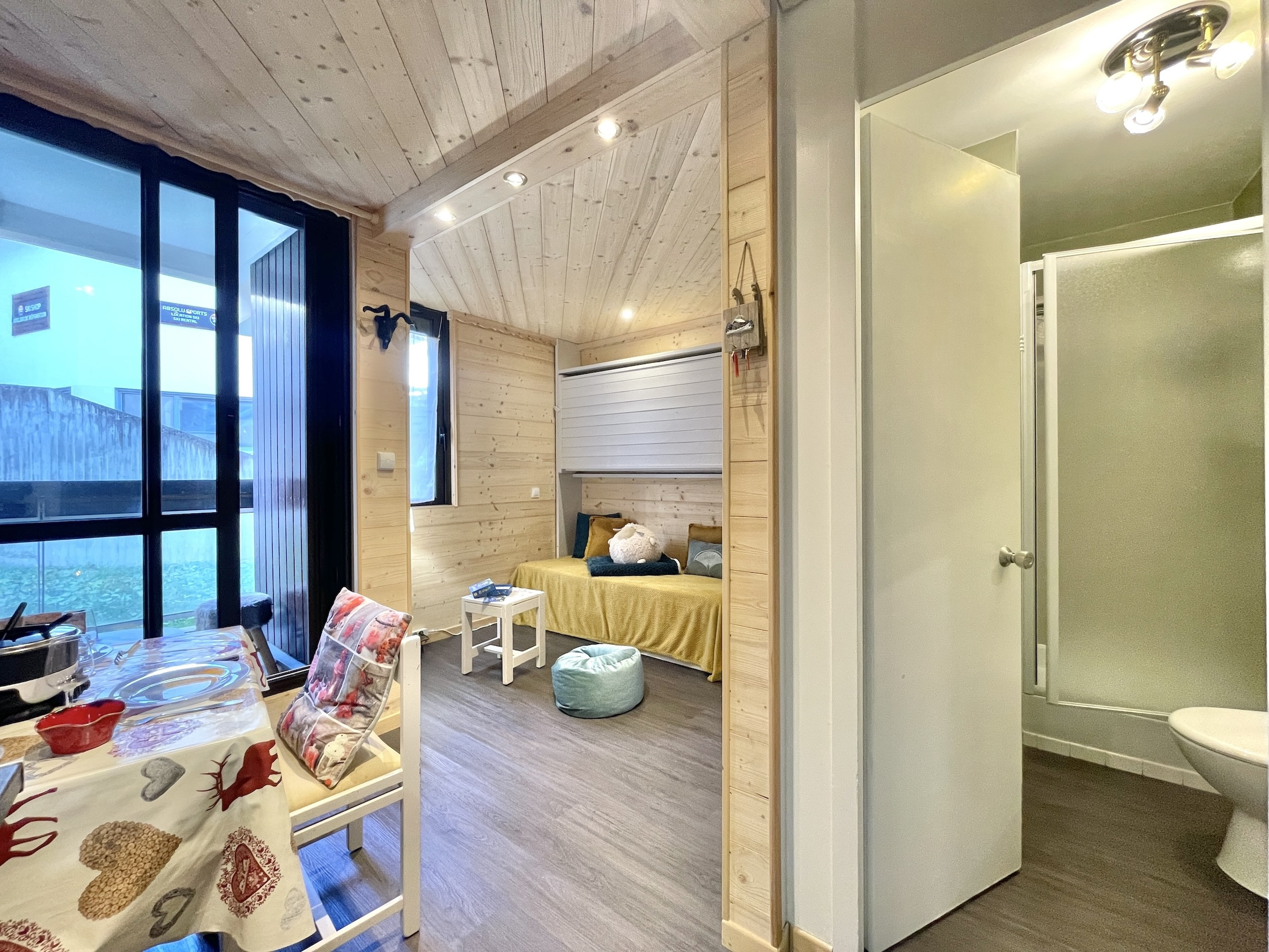 La salle de bain avec une douche et des toilettes complète cet espace chaleureux, tandis que le balcon exposé est vous permet de profiter de la lumière du matin. Le chauffage électrique et les volets roulants assure votre confort pendant les soirées fraîches de montagne. Un petit coin cocon où le repos et la détente sont les maîtres mots.